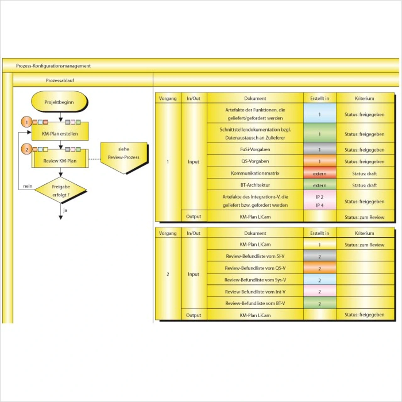 Auf der rechten Seite ist jeder Aktivität, gekennzeichnet durch eine ID, ein Textblock zugeordnet. In ihm sind die Eingangsartefakte (Input) und Ergebnisse (Output) definiert, sowie eine entsprechende Rolle, die das jeweilige Input zu erbringen hat. Die Farben entsprechen der linken Seite des Diagramms. Darüber hinaus wird jeder Rolle eine Zahl zugewiesen (vgl. Bild 3, Spalte „Erstellt in“), die den spätestens Erstellungszeitpunkt des Artefaktes liefert. Eine Analyse der zweiten Aktivität aus Bild 3 zeigt, dass zum Review der KM-Plan vom Konfigurations-Verantwortlichen (gelb) zu erbringen ist.