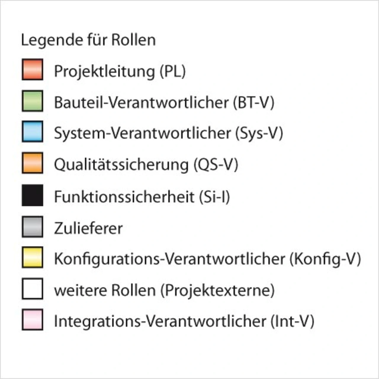 Die Notation für den Prozessablauf ist folgendermaßen definiert (Bild 4 ): Jede Aktivität (Rechteck) ist mit einer eindeutigen ID (Kreis in der linken oberen Ecke einer Aktivität) gekennzeichnet. Diese Nummerierung wird verwendet, um einen Referenzpunkt für andere Aktivitäten bzw. die Artefakte (rechte Seite des Diagramms) zu ermöglichen. Darüber hinaus ist die ID mit einer Farbe versehen. Jede Rolle im Projekt ist mit einer projektweit geltenden Farbe versehen (Bild 5). Für projektexterne Rollen oder derzeit undefinierte Rollen ist die weiße Farbe reserviert.