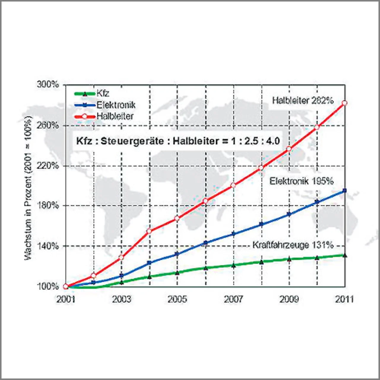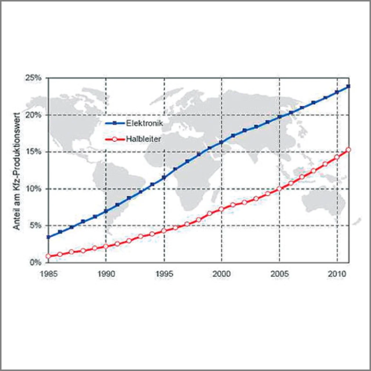 Während im Jahr 1985 bei einem mittleren Pkw der Anteil elektronischer Systeme an den gesamten Produktionskosten nur drei Prozent ausmachte, liegt heute dieser Wertanteil bereits bei etwa 22 Prozent des Produktionswertes. Gleichzeitig beträgt der Wertanteil der Halbleiter 12 Prozent. Wegen der zunehmenden Hochintegration elektronischer Systeme können Steuergeräte immer kleiner gefertigt werden. Neue Technologien auch in diesem Bereich ermöglichen es zusätzlich, Geräte direkt mit den von ihnen gesteuerten mechanischen Systemen zu verbinden (Mechatronik). Beide Trends führen dazu, dass der Halbleiteranteil an der Autoelektronik weiter zunimmt und Mitte der 2020er Jahre etwa 65 bis 70 Prozent erreichen wird. Der Wertanteil aller elektronischen Steuerungen im Fahrzeug wird bis dahin auf etwa 30 Prozent und der der Halbleiterbauelemente auf über 20 Prozent der Produktionskosten gestiegen sein (Bild 3). Es ist davon auszugehen, dass dann der Wertanteil der Mikroelektronik konstant bleiben und die weitere Zunahme der der Kfz-Stückzahlentwicklung entsprechen wird. Allerdings wird – zumindest bis 2011 – die Elektronik im Kraftfahrzeug (und damit insbesondere die Mikroelektronik) wesentlich stärker zunehmen als die Zahl der gefertigten Kraftfahrzeuge, wie aus Bild 4 deutlich zu entnehmen ist.