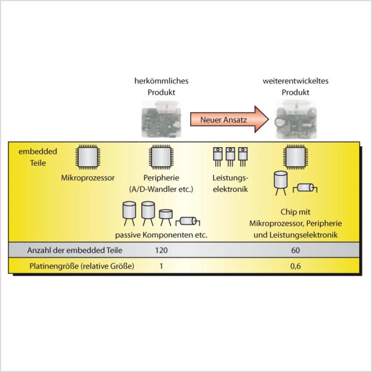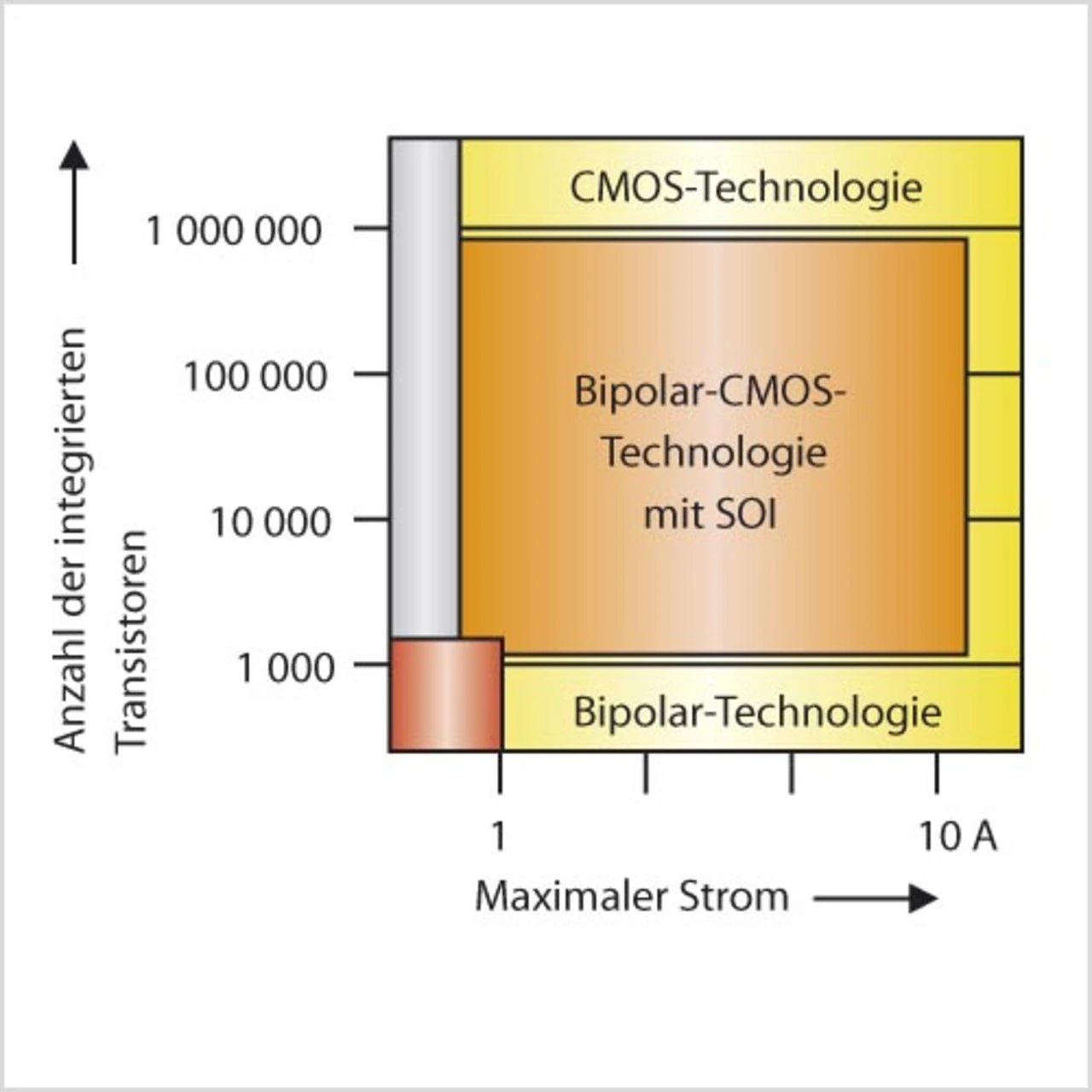 Bislang bestand ein Steuergerät für die Airbag-Steuerung aus rund 120 Teilen: Neben dem Mikroprozessor gab es noch einen separaten Chip für die Peripherie: z.B. für A/D-Wandler, Komponenten der Leistungselektronik (Power-MOS) und passive Komponenten. Ein neuer Airbag-Steuerungs-Chip integriert die MCU, Mixed-Signal-Komponenten und Power-MOS-Transistoren. Insgesamt konnte die Zahl der Teile auf 60 und die Platinengröße um 40 Prozent reduziert werden (Bild 2). Der NDR (Nippon Denso RISC) genannte 32-bit-Mikroprozessor wurde speziell für den Automobilbereich optimiert. Um die Power-MOS-Transistoren von der Logik und den analogen Schaltkreisen zu isolieren, die im Niedrigspannungs-Bereich arbeiten, stellt Denso die Chips in einem SOI-Prozess (Silicon-On-Insulator) her. Wie in Bild 3 ersichtlich ist, kombiniert dieser Prozess den Vorteil von CMOS (hohe Anzahl Transitoren) mit hohen möglichen Strömen.