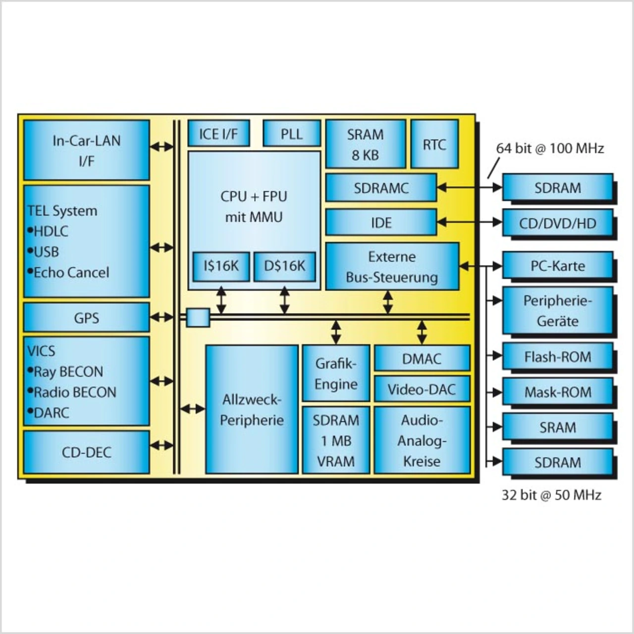 Bild 4 zeigt eine MCU, die für ein Navigationssystem entwickelt wurde. Der Chip integriert einen Prozessor, FPU, Speicher-Management-Einheit (MMU), Peripherie, 1 Mbyte Video-RAM, einen DMA-Controller, einen GPS-Empfänger, Audio-Bausteine, eine Graphics-Engine, zahlreiche I/O-Schnittstellen wie LAN und USB und einen VICS-Empfänger (Vehicle Information and Communication System, siehe Kasten). Des Weiteren befinden sich 8 Mbyte Embedded DRAM und 1,4 Millionen Logik-Gatter auf dem Chip. Der 0,18-μm-CMOS-Chip wurde gemeinsam mit Toshiba entwickelt. Der GPS-Navigator hebt sich insoweit von „gewöhnlichen“ GPS-Chips ab, indem die Positionsfehler dadurch verringert werden, dass das vom Satelliten empfangene Signal mit einem Signal abgeglichen wird, das von einer terrestrischen Station gesendet wird.