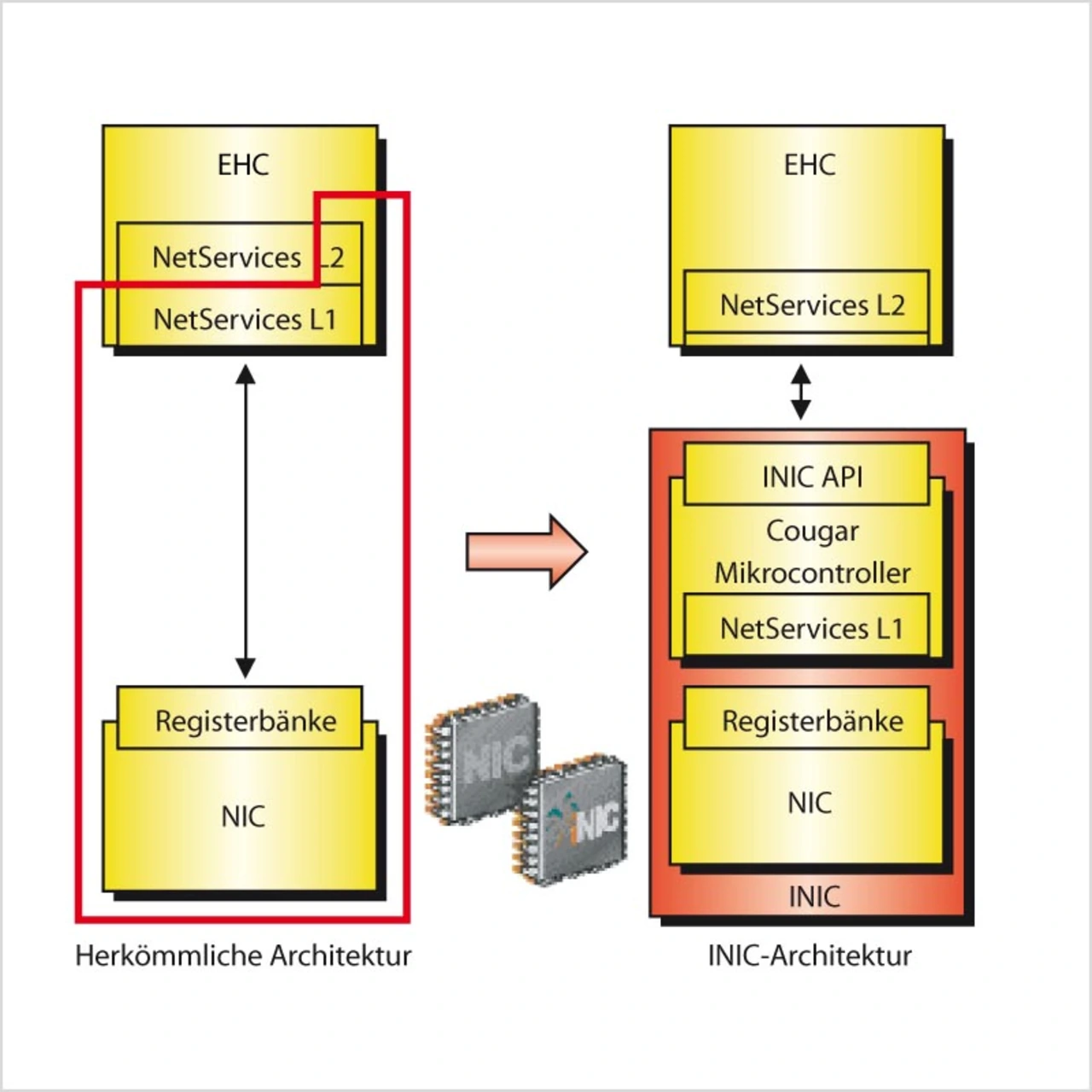 Ende 2002 wurde eine neue Architektur für MOST-Netzwerk-Interface- Controller vorgestellt. Verkörpert wird diese neue Architektur im INIC. Dabei werden große Teile des Netzwerktreibers auf dem Netzwerk-Interface-Controller integriert (Bild 1).