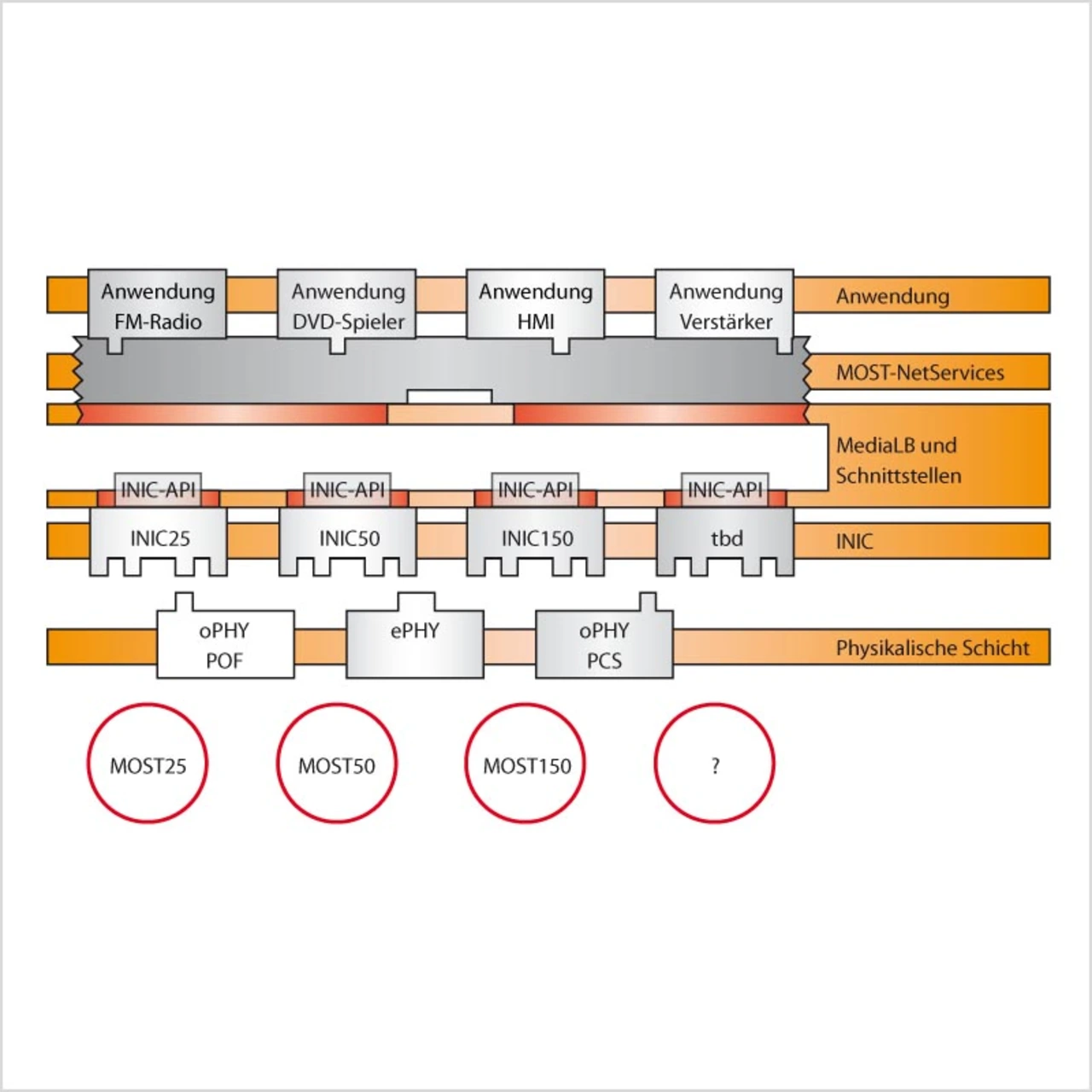 Die Entwicklung von MOST-fähigen Geräten wird durch einen neuen Partitionierungsansatz erheblich vereinfacht Bild 2). Grundlage dieses Partitionierungsansatzes ist die INIC-Architektur. Auf dieser Architektur basierende Bausteine sind sowohl für MOST25 als auch für MOST50 und MOST150 verfügbar.