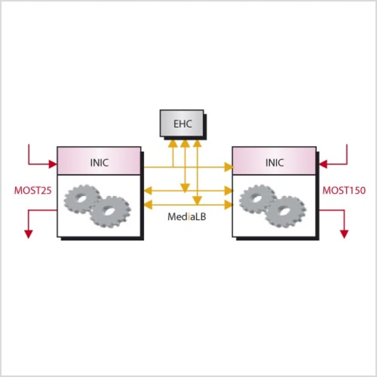Es ist denkbar, dass neue MOST- 150-basierte Anwendungen in bestehenden Fahrzeugplattformen, die MOST25 nutzen, integriert werden sollen. Dieses Szenario bedeutet zunächst einmal getrennte Netzwerke mit unterschiedlichen Netzwerk-Bandbreiten. Mit MediaLB können solche Netzwerk-Gruppen (Cluster) zu einem Netzwerk verbunden werden. Hierbei können sowohl die Netzwerk-Bandbreite als auch das physikalische Übertragungsmedium komplett verschieden sein. Zur Verbindung beider Cluster können zwei INICs über MediaLB miteinander verbunden werden, wobei jeder von ihnen als Netzwerkschnittstelle zu „seinem“ Netzwerk-Cluster genutzt wird (Bild 3).