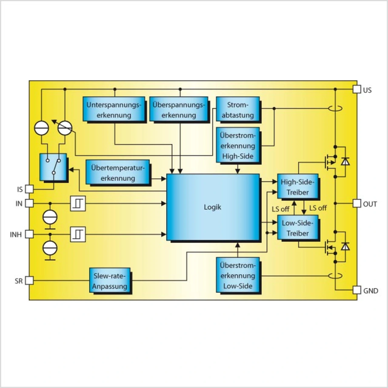 Die neue, RoHS-konforme Novalith-IC-Familie von Infineon (www.infineon.com) unterstützt PWM-Applikationen mit Frequenzen bis zu 25 kHz für Motorantriebe mit Strömen bis 70 A. Sie kombiniert drei separate Chips in einem Gehäuse: einen p-Kanal-MOSFET (High-Side), einen n-Kanal-MOSFET (Low-Side) und ein Treiber-IC in einer Halbbrücken-Konfiguration (Bild). Die Bausteine eignen sich für Applikationen wie Klimalüfter, Sitzgurt-Systeme oder für Benzinpumpen. Die Leistungsschalter verwenden vertikale MOS-Technologien für einen optimierten Durchlasswiderstand. Durch den p-Kanal-High-Side-Schalter kann auf eine Ladungspumpe verzichtet werden, was das EMV-Verhalten verbessert. Integrierte Funktionen wie Logik-Level-Eingänge, Diagnosefunktionen, Slew-Rate-Abgleich, Totzeit-Generierung sowie diverse Schutzfunktionen sorgen für einen einfachen Anschluss an den Mikrocontroller.