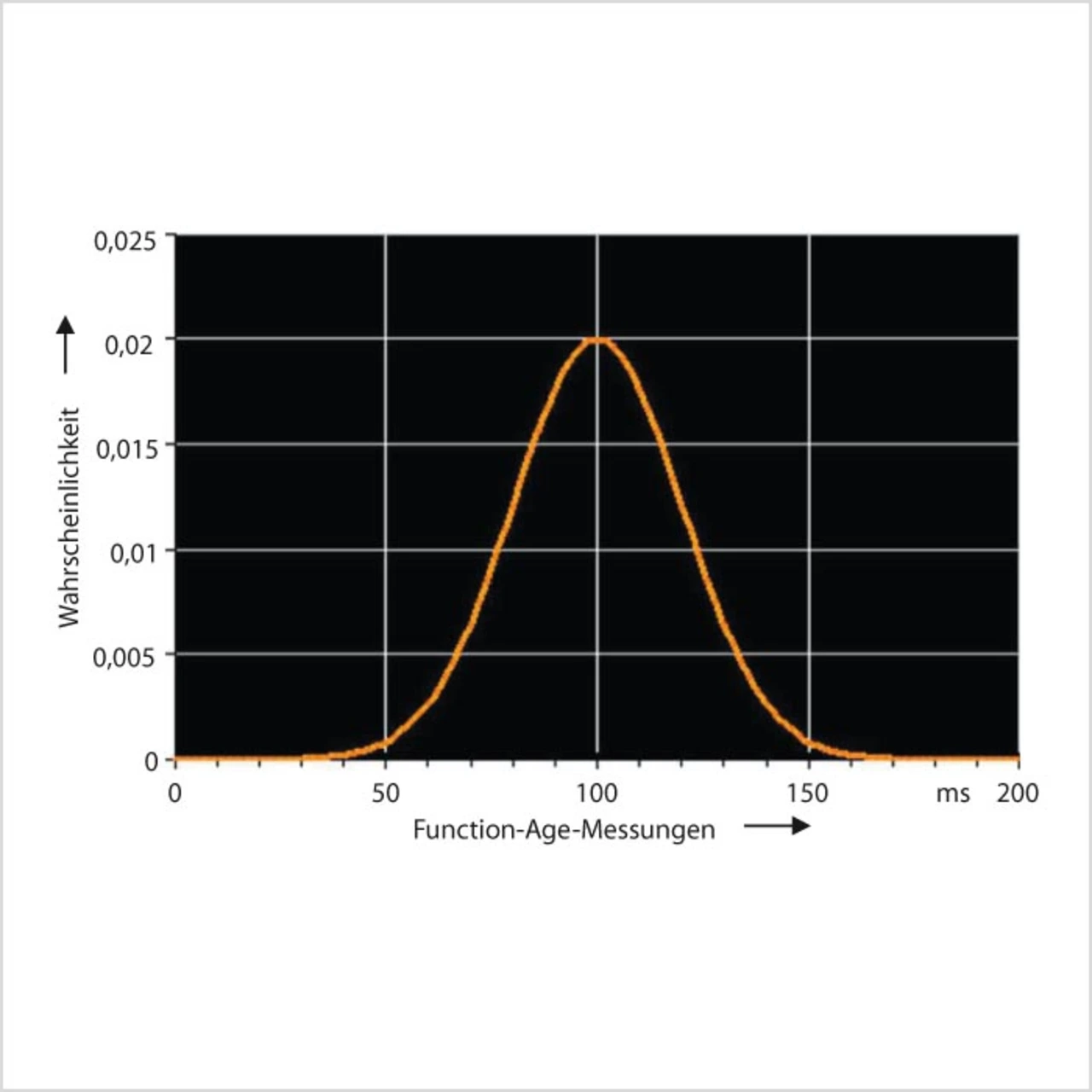 Es ist offensichtlich, dass in 14 Prozent die Ausführung der Funktion zu einem hohen Risiko führt. Dies gibt den klaren Hinweis, dass weitere Messungen durchgeführt werden müssen, um diese ersten Ergebnisse mit statistisch relevanten Daten belegen zu können. Nachdem dann aber in dem Beispiel 1000 oder mehr Messungen durchgeführt wurden, ergeben die Messergebnisse die erwartete Normalverteilung über der Zeit.