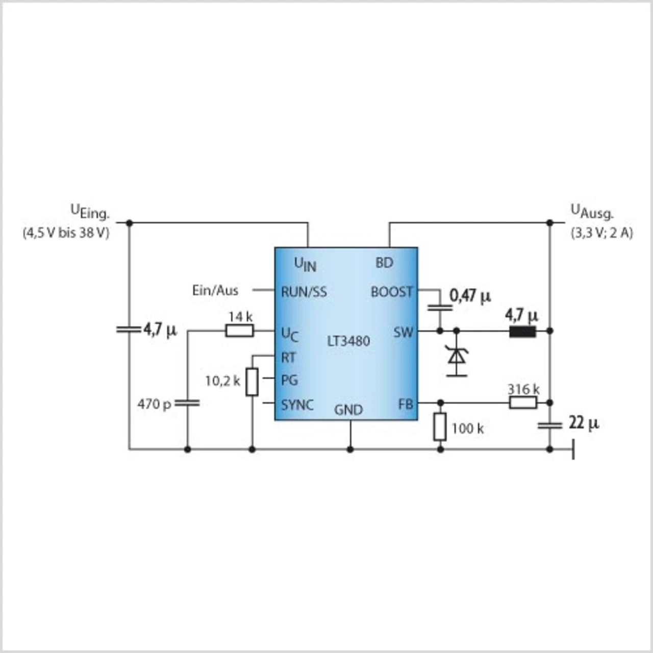 Der Baustein integriert einen 3-A/ 0,25-Ω-Schalttranssistor, die erforderliche Boost-Diode, einen Oszillator und die Logik. Der Burst-Modus gewährleistet bei niedrigen Ausgangsströmen einen hohen Wirkungsgrad und eine Ausgangsspannungswelligkeit von weniger als 15 mVss. Der hohe Wirkungsgrad über den gesamten Eingangsspannungsbereich wird möglich durch spezielle Design-Verfahren und einen neuen Hochspannungs- Halbleiterprozess. Die „Current Mode“-Topologie wiederum sorgt für kurze Einschwingzeiten und eine hohe Stabilität der Regelschleife. Weitere Funktionen des Chips sind eine externe Synchronisation von 250 kHz bis 2 MHz, ein „Power Good“-Signal sowie eine „Soft Start“-Funktion.