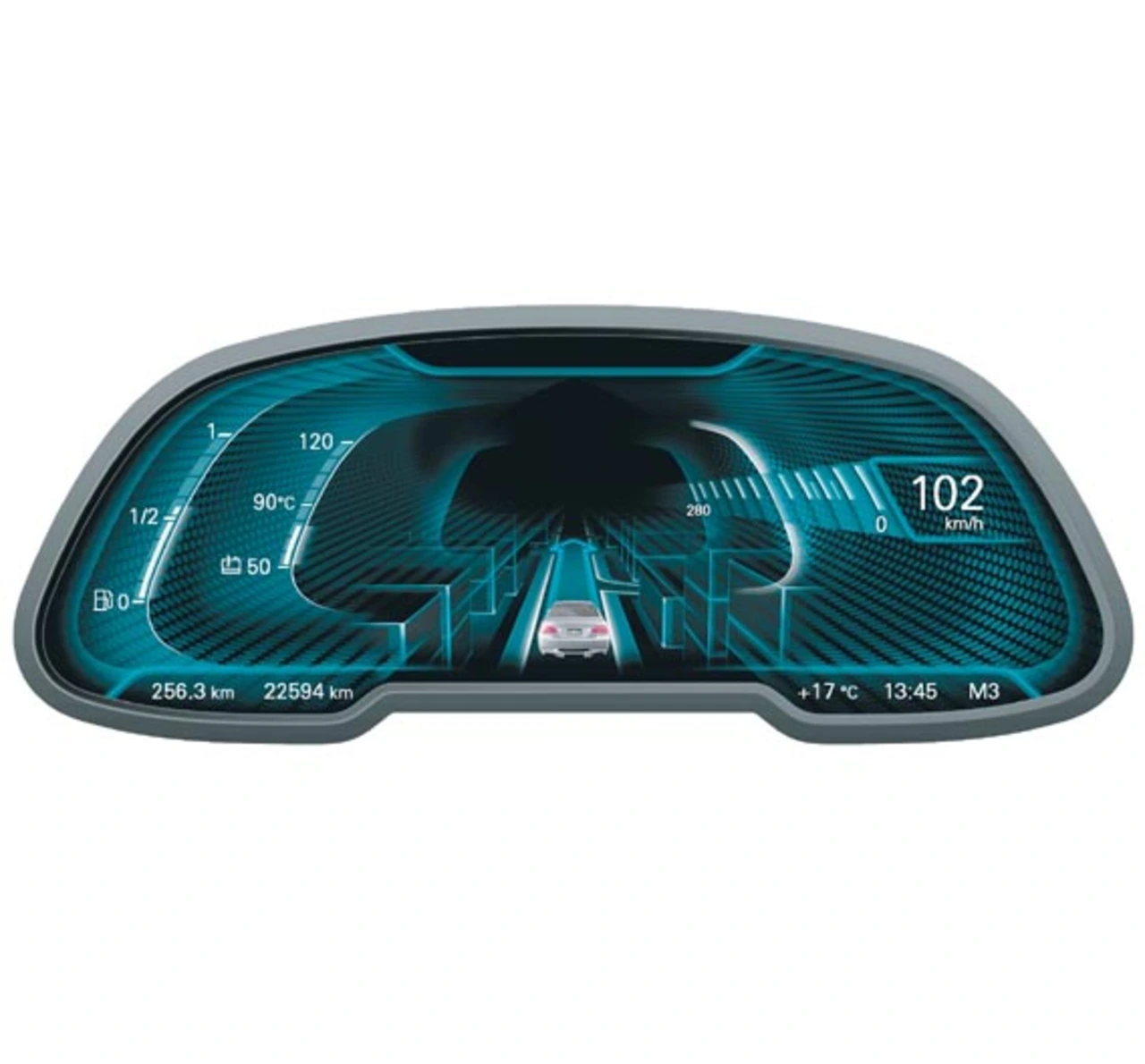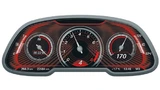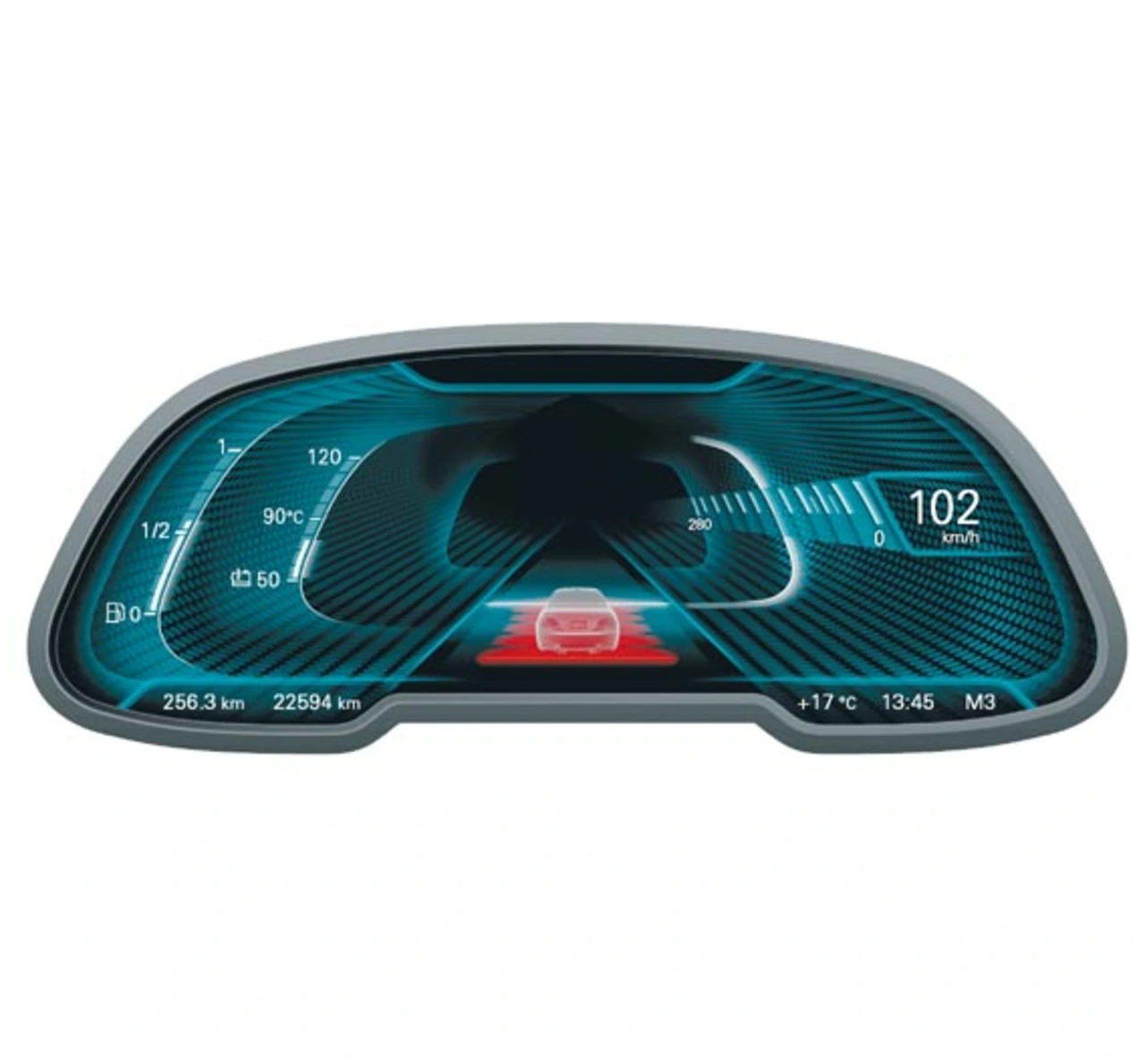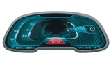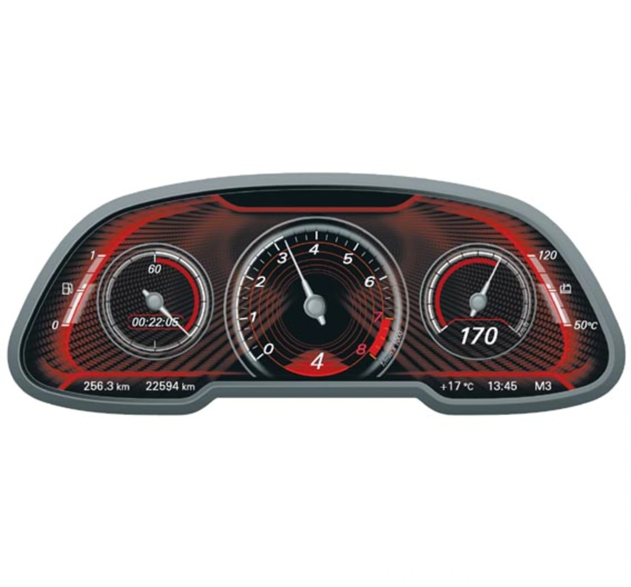 Das sportliche Design zeigt die Schwerpunktverlagerung der Anzeige durch drei wesentliche Faktoren. Die Farbwelt „Fire“ soll Energie und Vitalität widerspiegeln – in Kombination mit der Darstellung von klassischen Rundinstrumenten und einer grundlegend veränderten Priorisierung des Informationsgehalts (Bild 7). Diese visuelle Umschaltung ließe sich zusätzlich mit einem adaptierten Fahrverhalten, wie beispielsweise der Straffung des Fahrwerks, untermalen. In diesem Modus werden aus dem Bereich Komfortfunktionen nur minimalistische Informationen bereitgestellt, um die Konzentration auf die primäre Fahraufgabe zu gewährleisten. Fokus in der sportiven Darstellung ist der Drehzahlmesser, der mittig angeordnet ist und über einen variablen Rotbereich verfügt. Die Geschwindigkeit wird als klassischer Zeiger und eine klar ablesbare Zahl rechts eingeblendet. Die Stoppuhr auf der linken Seite rundet den Sportmodus ab.