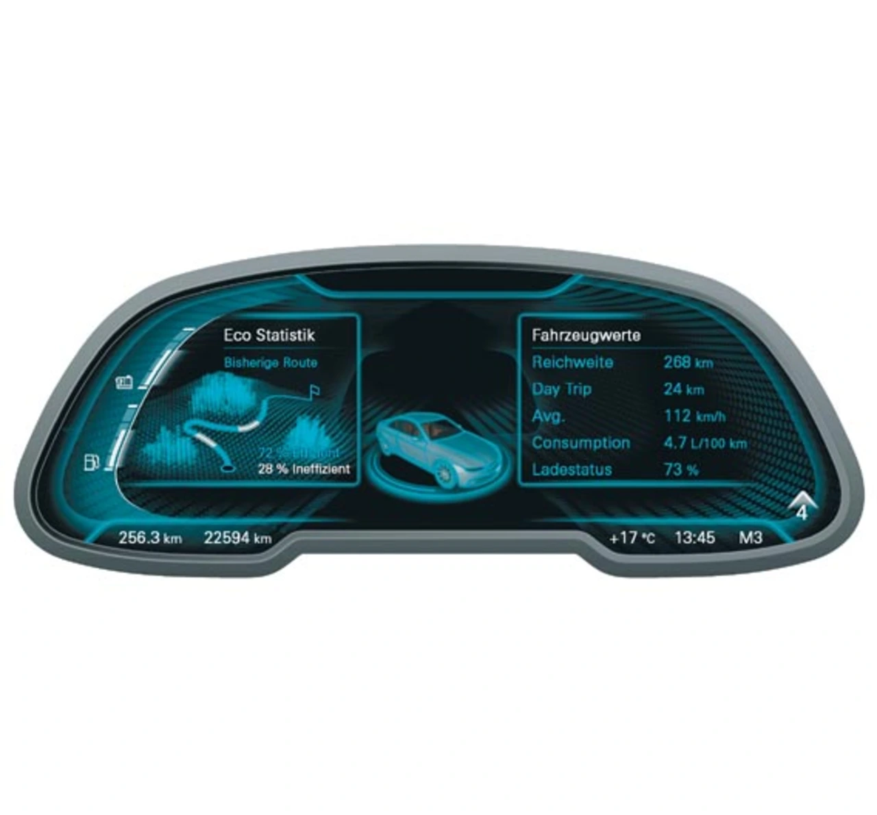 Diese Variante kommt primär im Stopp-Betrieb zum Tragen. Dieser Modus erlaubt es, die sonst wichtigen Informationen, wie Geschwindigkeit, auszublenden. Der Fahrer kann die gesamte Bildschirmfläche flexibel nutzen und Elemente vergrößern. Informationen über die Route oder den Fahrzeugzustand können zur Anzeige gebracht werden (Bild 8). Denkbar ist auch eine Übertragung des Ampelzustandes oder der Restdauer der roten Phase in das Fahrzeug. Diese Referenz-Applikation nutzt als technische Basis die Grafikprozessor- Einheit (GPU) MB86298 Ruby in Kombination mit dem ARM-Cortex- Entwicklungs-Kit sowie Linux als Betriebssystem. Hierbei konnte der gesamte Entwicklungsprozess vom Entwurf bis zur Implementierung abgebildet werden. Das Zusammenspiel der Komponenten und die Leistungsbeurteilung waren wichtige Meilensteine. Bis jedoch der Fahrer seine individuelle Darstellung auswählen und in das Fahrzeug übertragen kann, ist es noch ein weiter Weg.