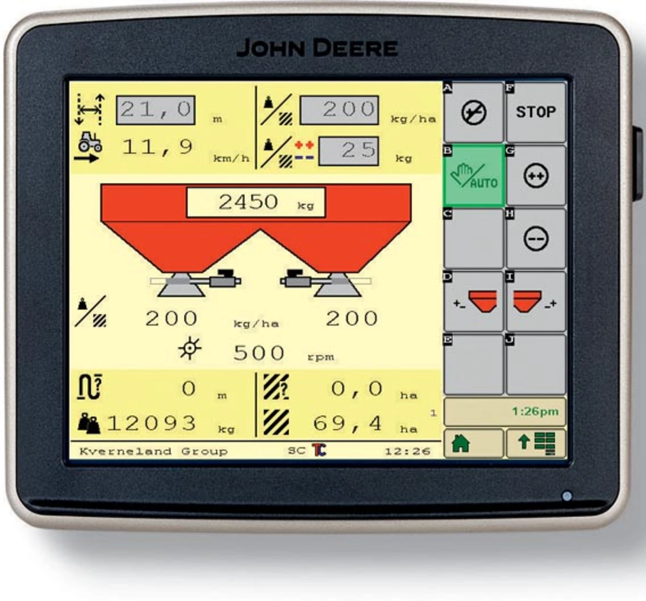 Diese Funktionen erfordern eine genaue Kenntnis der technischen Daten und Funktionen des Anbaugeräts seitens der Traktorelektronik. Das Isobus-Bedien-Terminal ist meist nicht nur ein Bedien- und Anzeigesystem, sondern ein Mini-Computer, auf dem gleichzeitig mehrere Anwendungen laufen, wie z.B. der Task Controller, der in ISO 11783 Teil 10 beschrieben ist. Er dient im Idealfall gleichzeitig als ein Dokumentations- und Steuerungssystem mit einer Schnittstelle über die TaskData.xml-Datei zum Farm-Management-System. Im „John Deere GreenStar 2630 Display“ stellt der Task Controller eine Schnittstelle zwischen dem Dokumentationssystem und einem Isobus-Anbaugerät dar. Beim ersten Ankoppeln lädt der Task Controller ein „Device Description File“ vom Rechner des Anbaugeräts. Diese Gerätebeschreibungsdatei enthält alle für den Task Controller notwendigen Informationen, wie Arbeitsbreite, Art der Aufhängung zum Traktor oder ggf. die Anzahl der schaltbaren Sektionen mit zugehörigen Elementnummern. Das Anbaugerät lässt sich über die Bedienkonsole des Traktors bedienen (Bild 1).
