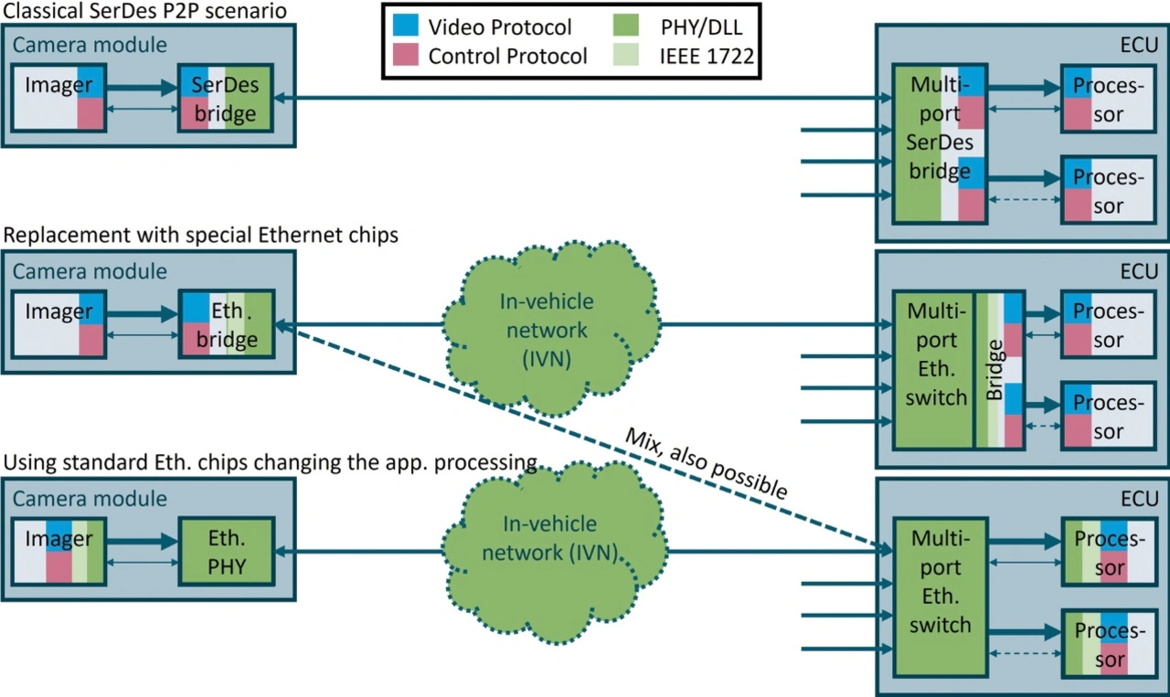 Eine weitere wichtige Anforderung ist die Flexibilität in der Architektur. Dies impliziert effiziente P2P-, Aggregations-, Zonen-, Weiterleitungs- und andere Optionen. Dazu gehört auch die Möglichkeit, Sensoren über SerDes oder über Ethernet anzuschließen und einen fließenden Übergang dazwischen zu ermöglichen. Die heutigen Kamerakommunikationstechnologien sind für die Übertragung von Kameravideodaten ausgelegt, und die Prozessoren haben ihre Verarbeitungsketten für das verwendete Kameravideoprotokoll, typischerweise MIPI CSI-2, optimiert. Soll heute Ethernet statt SerDes verwendet werden, müssen entweder Standard-Ethernet-Komponenten um eine Protokollumsetzung erweitert werden (dann sind sie nicht mehr Standardkomponenten), oder die Prozessoren müssen ihre Verarbeitungsketten anpassen (Bild 2). Wenn beides zu viel Aufwand und Kosten bedeutet, wird es nicht angenommen werden.