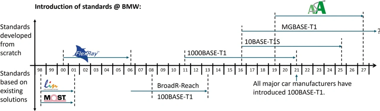 4. Zeitplan: Schließlich ist es wichtig zu überlegen, wann ein Wechsel und die Einführung eines Standards erfolgen kann. In der Regel vergehen acht bis zehn Jahre zwischen der Initiierung eines Kommunikationsstandards und der Einführung in das erste Serienfahrzeug (siehe Bild 3 für den Zeitplan bei BMW). Die branchenweite Einführung dauert noch viele weitere Jahre; im Falle von 100BASE-T1-Ethernet z. B. acht. Diese lange Vorlaufzeit ist auch deshalb erforderlich, weil Automobilhersteller eine neue Kommunikationstechnologie in der Regel nur mit einer neuen Elektrik- und Elektronikarchitektur (EE) einführen können. Weil diese EE-Architekturen in bestimmten Zeiträumen entwickelt werden, in der Regel alle drei bis sieben Jahre, könnte ein Hersteller gerade die nächste Gelegenheit verpasst haben.