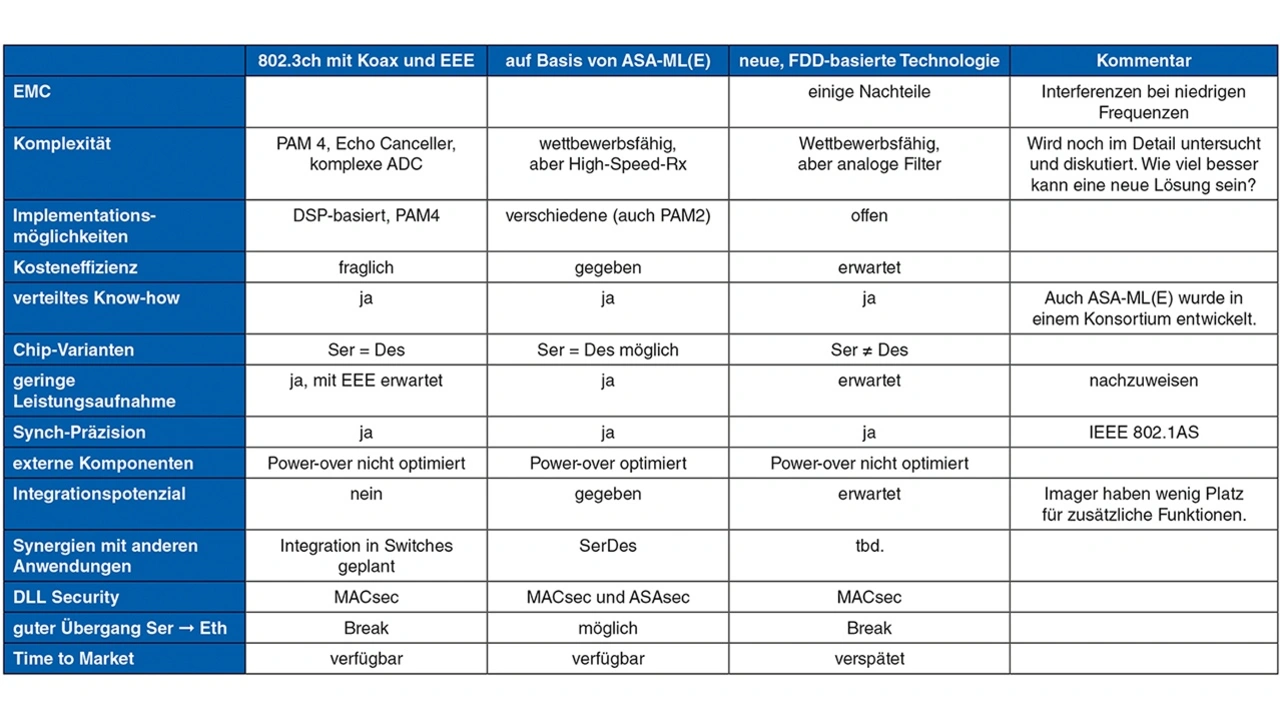1) Funktionierende Technik: Natürlich muss das technische Verfahren im anspruchsvollen automobilen Umfeld bestehen. Dazu gehören die Unterstützung der richtigen Datenraten (ob 10 Gbit/s für Sensoren ausreichen, ist in der Branche umstritten) und bis zu 15 m Verbindungslänge (vier Inline-Stecker) für elektromagnetische Emissionen und Störfestigkeit. Darüber hinaus ist ein niedriger Stromverbrauch von entscheidender Bedeutung (die Qualität des Bildsensors nimmt mit der Temperatur ab), und im Falle mehrerer koordinierter Sensoren, insbesondere Radarsensoren, ist eine Synchronisationsgenauigkeit im ns-Bereich erforderlich. Allerdings ist die Erfüllung der technischen Ziele nur eine notwendige (aber nicht hinreichende) Voraussetzung für den Erfolg der Technologie. Eine Übererfüllung der Anforderungen hilft in der Regel nur in Randszenarios. Die Mehrheit der Kunden würde dafür nicht zahlen. Natürlich sollten bekannte Mängel behoben werden, aber erfolgversprechender ist es, auch die Anforderungen der Punkte 2 bis 4 zu erfüllen.