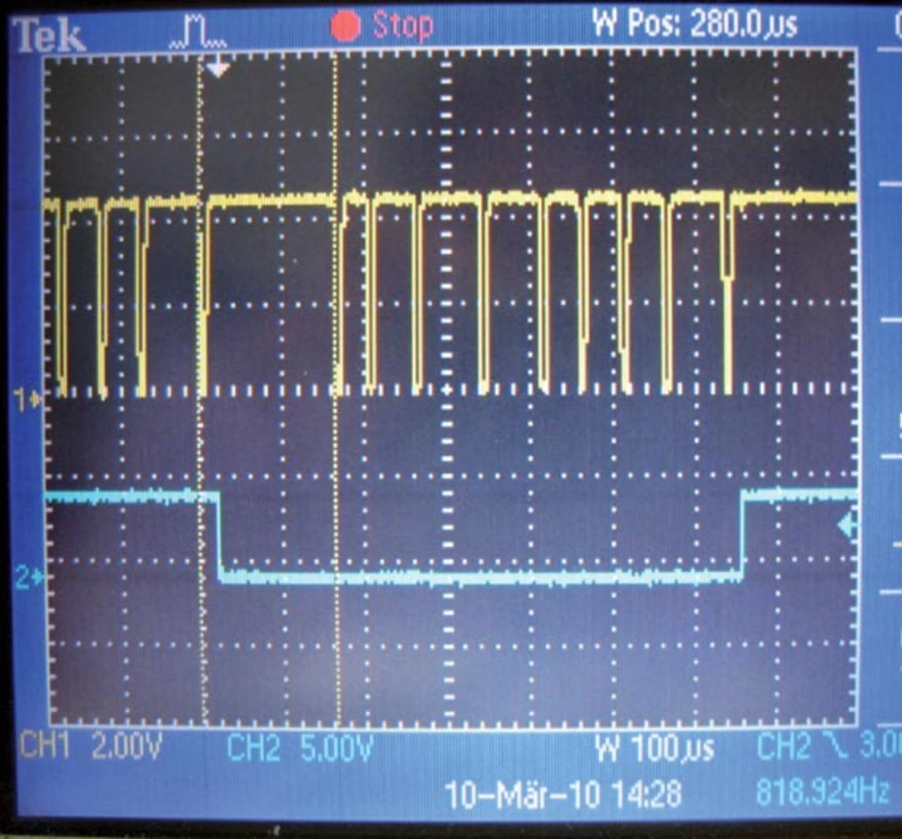 Jeder Daten-Frame beginnt mit einem Sync-Intervall bekannter Dauer. Der Mikrocontroller misst diese 168 µs lange Periode und benutzt diese Referenz später bei der Auswertung der Zeiten jedes einzelnen Nibbles (Bild 2).