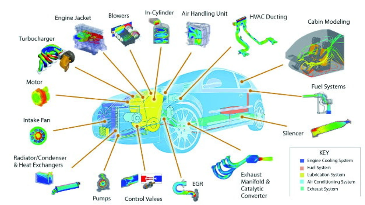 Das luftseitige Motorsystem kann die Leistungsfähigkeit signifikant beeinflussen. Darüber hinaus wird die Aerodynamik dank neuer Technologien wie aktive Luftklappensysteme und das Stapeln von Wärmetauschern positiv beeinflusst. Das Kühlsystem des Motors ist der nächste Schritt im Thermomanagement, mit der Wärmeabfuhr zwischen dem Motor und dem Kühlungssystem. Um hier die Performance zu optimieren, muss das System in einem engen Temperaturbereich arbeiten. Daher sind Wärmetransfer bei stehendem Fluid und optimal gesteuerter Kühlmittelstrom entscheidend, um eine bestmögliche Effizienz zu erreichen. Meist wird das Abgassystem als Bestandteil des Antriebsstrangs betrachtet, da es wesentlich zur Leistungsfähigkeit des Motors mit Turboladern, Abgasrückführung (EGR) und Wärmerückgewinnung beiträgt. Eine optimierte Strömung und reduzierte Druckverluste im System zusammen mit der Leistung der Komponenten wie Katalysatoren und Schalldämpfer sind wichtig für das Design des Abgassystems.