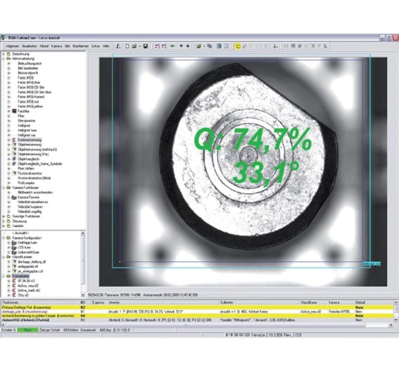 Im nächsten Schritt wird der auf dem Warenträger befindliche Knopf für die Lautstärkeregelung auf den Lautstärke-Encoder der Leiterplatte gelegt (Bild 1). Beide haben eine Anfasung, die beim Fügen durch die Maschine gradgenau übereinander gebracht werden muss. Zur Ermittlung der aktuellen Drehlage des Lautstärke-Encoders wird der komplette Prüfling aus dem Transportband gehoben und mechanisch fixiert. Eine homogene, koaxiale Auflichtbeleuchtung und eine hochauflösende CCD-Kamera mit Messobjektiv ermöglichen eine scharfe Abbildung des Lautstärke-Encoders.