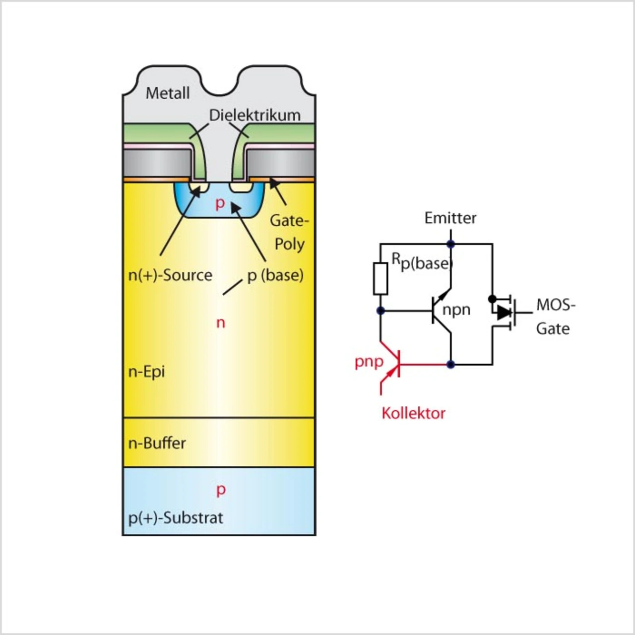 In industriellen Motorsteuerungen gehören IGBTs (Insulated Gate Bipolar Transistor) derzeit zu den am häufigsten eingesetzten Schaltbauteilen in Motorumrichtern. Mit der kommenden Hybridisierung werden die IGBTs bald auch den Markt des Automotive-Leistungspfades erobern. Der IGBT ist ein MOS-Gate-gesteuerter Leistungsschalter. Die Zell-Struktur und die Fertigungsprozesse sind sehr ähnlich wie bei einem MOSFET. Der MOS-Gate-Kanal ist mit zwei n(+)-Typ-Regionen verbunden, die in benachbarten p-Wannen in einer n-leitenden Epi-Schicht eingebettet sind. Diese wiederum befinden sich auf einem p-leitenden Wafer. Diese Struktur des klassischen PT-IGBTs (Punch-Through) wurde vor ungefähr 25 Jahren von Frank Wheatley erfunden. Bild 1 zeigt die Grundstruktur und das Ersatzschaltbild eines IGBT. Ein NPT-IGBT (Non-Punch-Through) wird auf der Basis eines n-leitenden Substrats mit einem p(+)-Implantat und anschließender Bearbeitung der Oberseite und Wafer-Dünn-Ätzen hergestellt.