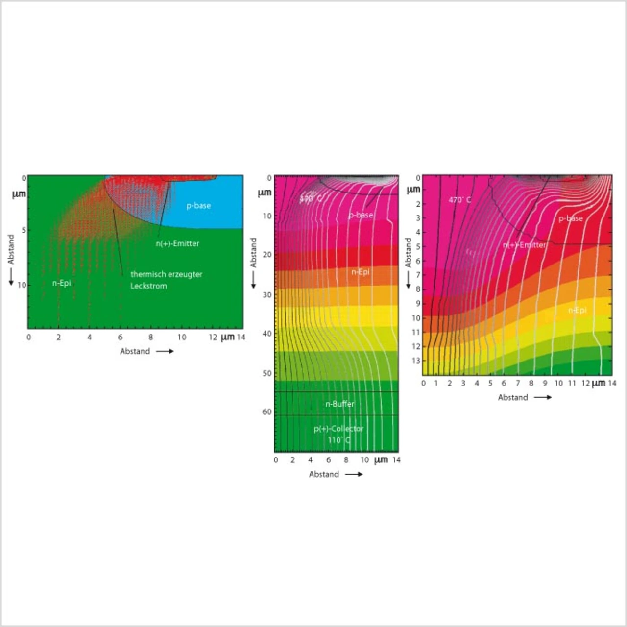 Bild 2 zeigt einen simulierten Ausfall eines IGBT beim Ausschalten. In der Mitte wird die IGBT-Struktur von der Oberfläche bis zu einer Tiefe von 65 μm dargestellt, auf der rechten Seite werden die Temperatur und der Stromfluss für die obersten 14 μm gezeigt.