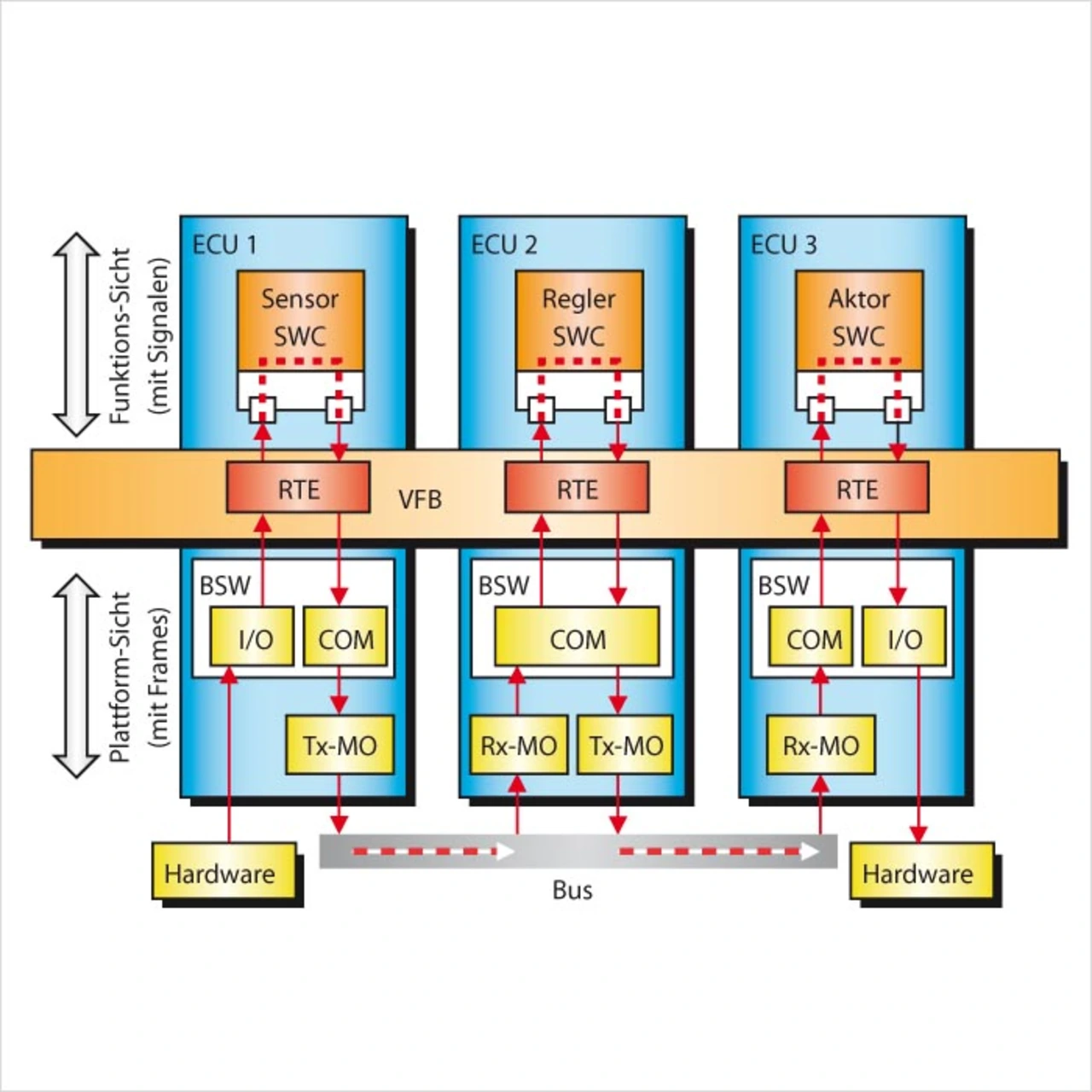 Die Beantwortung dieser (und weiterer) Fragen erfordert zunächst ein Verständnis des Zeitverhaltens verteilter Systeme und dann einen systematischen Umgang damit. Bild 3 zeigt den Signalfluss des Beispielsystems, diesmal unter Einbeziehung der Software-Architektur bei Verteilung auf drei ECUs.