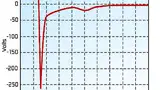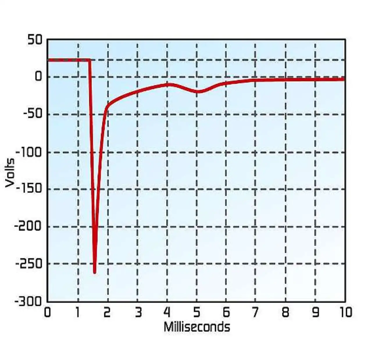 Bild 1 zeigt das Ergebnis eines Tests, in dem ein Relais bei 24 V erregt und dann getrennt wurde. Die Spannungsspitze, die durch die Spuleninduktivität erzeugt wird, beträgt -260 V. Dies ist tatsächlich die Spannung, die getrennt wird. Und so kommt es dazu, dass ein Steckverbinder während einer Trennung unter Spannung schmilzt: Zunächst ist der elektrische Widerstand niedrig.