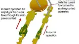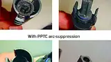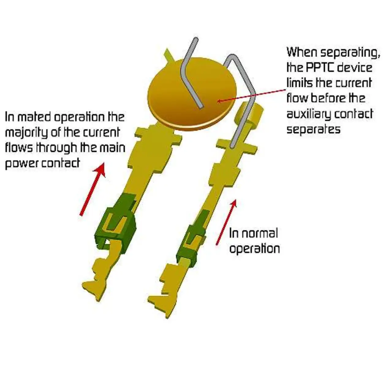 Zur Lichtbogenunterdrückung enthält der Steckverbinder einen rücksetzbaren PPTC-Baustein (Polymeric Positive Temperature Coeffizient; Kaltleiter aus Polymer). Ein PPTC-Baustein parallel zum Steckverbinder erwärmt sich durch den beträchtlichen Spannungsabfall beim Trennen unter Spannung und geht in einen hochohmigen Zustand über (Bild 2).