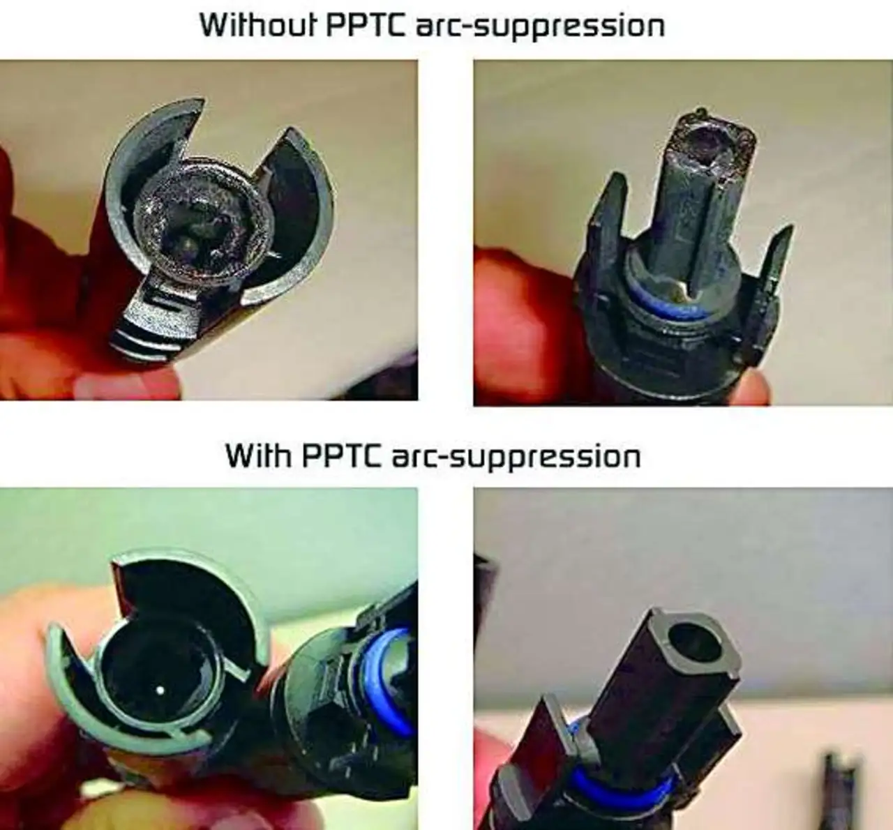Bild 3 zeigt die Auswirkungen eines Plasmalichtbogens auf zwei Photovoltaik-Steckverbinder in einem Test bei 550 V (DC) und 20 A.