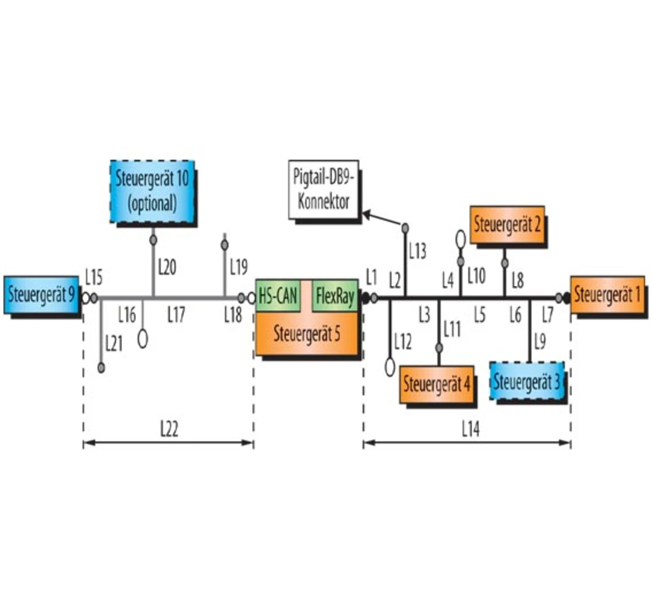 Der in Bild 4 abgebildete Netzwerkaufbau wurde verwendet, um sowohl den FlexRay-Bus-Schedule als auch den Applikations-Schedule des Systems zu validieren. Es können damit Systeme mit maximal acht FlexRay-Steuergeräten, fünf CAN-Steuergeräten und einem FlexRay/CAN-Gateway untersucht werden. Für FlexRay wurde ein einfacher passiver linearer Bus mit 24 m Länge und einer Datenübertragungsrate von 5 und 10 Mbit/s verwendet. Als Steuergeräte wurden EB6120 Prototyping ECUs und eine MicroAutobox eingesetzt. Mit diesem Netzwerkaufbau wurde eine Vielzahl an Tests durchgeführt und dokumentiert.
