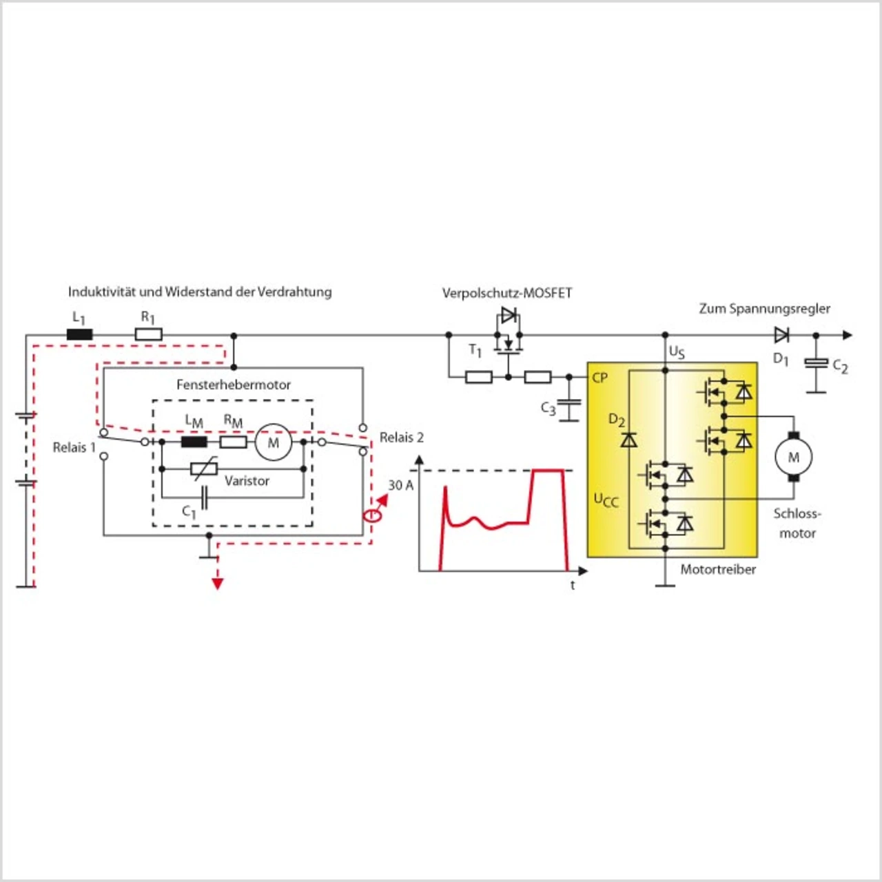 Der Fensterhebermotor eines Kfz erreicht beim Anschlag einen Blockstrom im Bereich von 30 A und gelegentlich auch darüber. Auf diesen Wert lädt sich die Motorinduktivität LM auf, aber auch die Induktivität der Verdrahtung zwischen Relais-Brücke und Batterie (Bild 1).