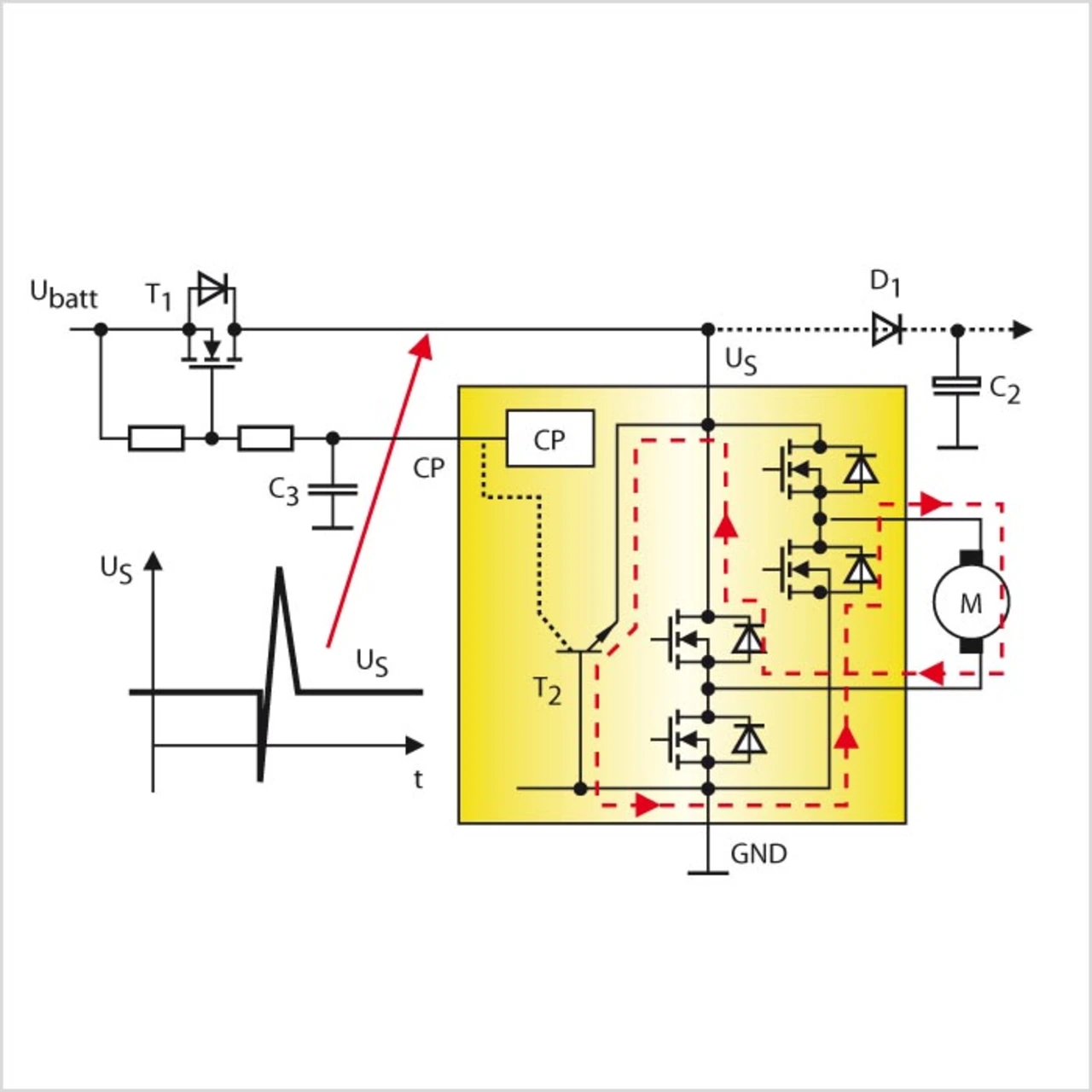 Eine ähnliche Situation kann auch entstehen, wenn der Modulstecker zu einem Zeitpunkt abgezogen wird, bei dem Motoren noch bestromt sind. Hier findet die Freilaufenergie – auch wenn T1 leitend ist – keinen Rückweg, der die Spannung klemmt. Es ist also empfehlenswert, in jeder Schaltungsoption quasi einen Notausgang für die Rückspeiseenergie vorzuhalten. Nur so lässt sich ein Design realisieren, das 0 ppm im Feld erreichen kann.