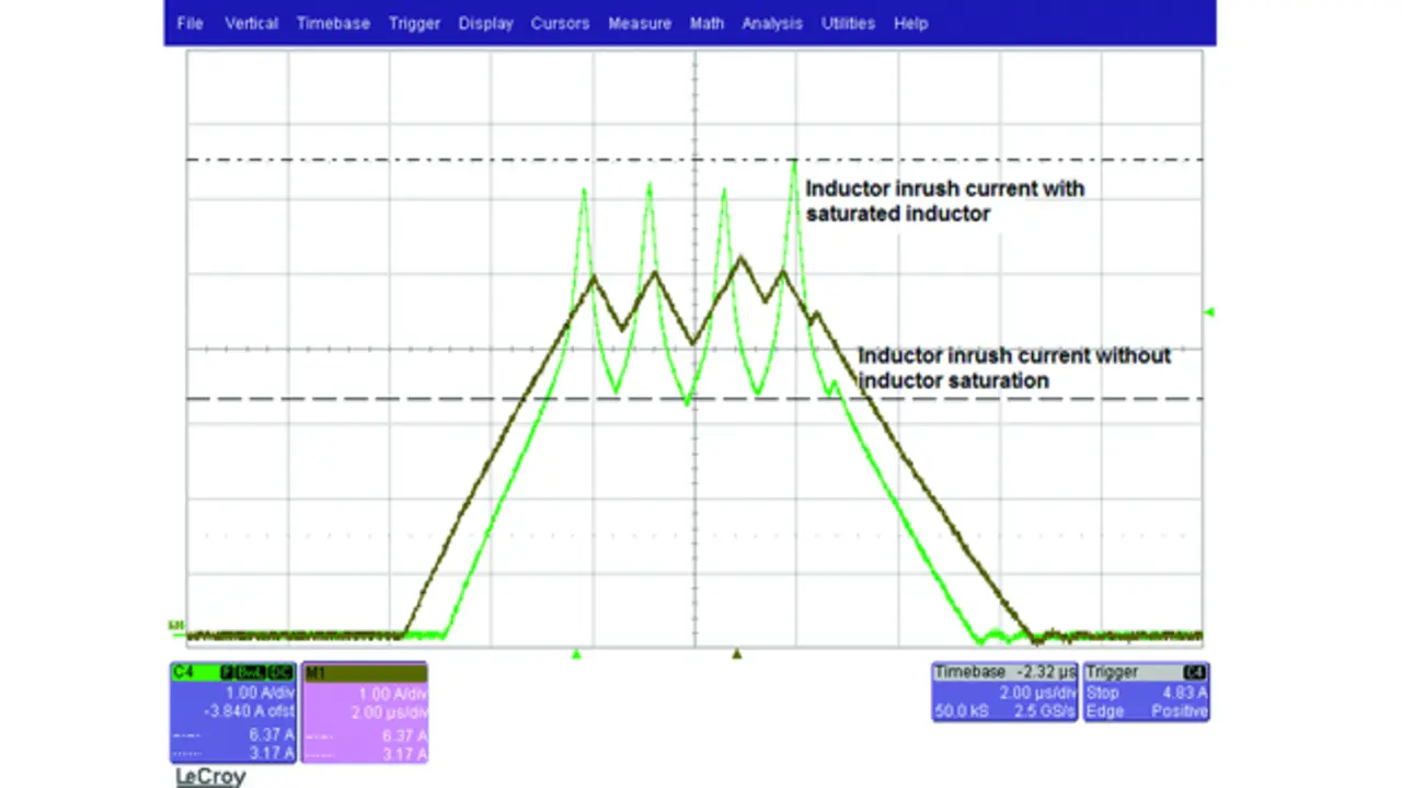 Obwohl die Regler über eine eingebaute Strombegrenzung verfügen, kann es bei einer Sättigung der Induktivität während des Betriebs passieren, dass während der Austastzeit der Strommessfunktion der Drosselstrom schnell auf einen hohen Wert ansteigt und das Regler-IC beschädigt. Wenn die Induktivität vollständig in die Sättigung gerät und ihre Induktivität verliert, kann außerdem die Eingangsspannung an den Ausgang durchschlagen und die für niedrige Spannungen ausgelegten Bauelemente am Ausgang des Reglers beschädigen.