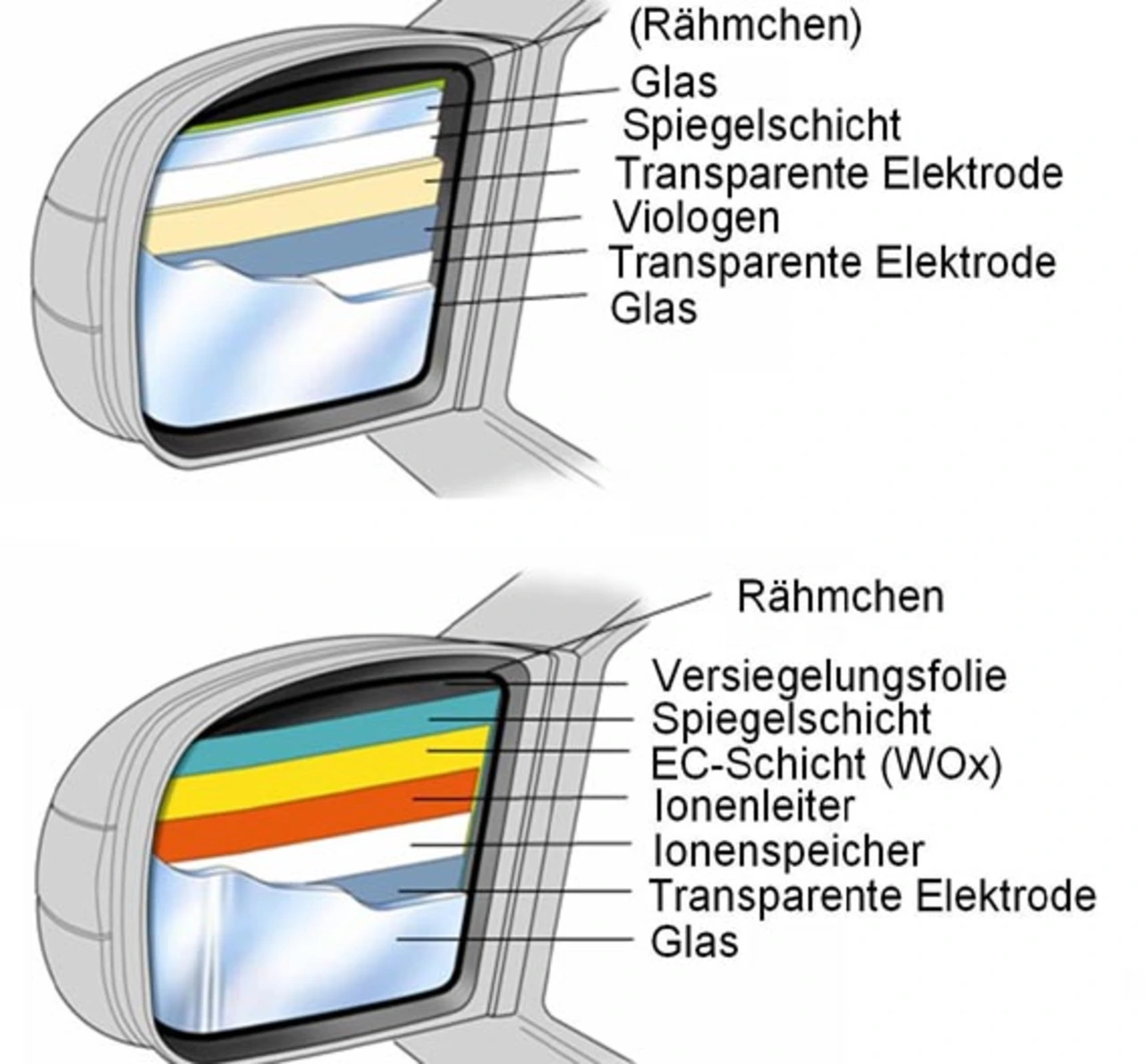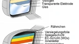 Beim EC-Spiegel von Flabeg handelt es sich um ein Festkörpersystem. Die Funktionsschichten werden mit einem Vakuumbedampfungsverfahren auf eine einzelne Glasscheibe aufgebracht. Wesentlich sind dabei eine Wolframoxidschicht, die sich mittels elektrischer Ladung (Ionen) einfärben lässt, und eine Ionen-Speicherschicht, in der diese Ladungen im Hellzustand des Spiegels gespeichert werden. Die Reflexion des Systems lässt sich von 65 % im Hellzustand auf 11 % im Dunkelzustand variieren. Im Gegensatz dazu bestehen konventionelle ECSpiegel aus zwei Glasscheiben, zwischen die eine spezielle Flüssigkeit, im Regelfall ein Viologen, gefüllt wird (Bild 3). Selbst bei der Verwendung dünner Gläser liegt das Gesamtgewicht konventioneller EC-Spiegel deutlich über dem des Flabeg-Spiegels. Durch das um rund 40 g niedrigere Gewicht pro Flabeg-Spiegel kann zusätzlich noch Gewicht bei den Antrieben und beim Gehäuse-Design generell eingespart werden. Die elektrische Funktionsweise eines konventionellen EC-Spiegels entspricht dem eines Widerstands bzw. einer quasi umgekehrt arbeitenden Glühlampe. Proportional zur angelegten Spannung dunkelt die Flüssigkeit zwischen den Glasscheiben ein. Es fließt dabei je nach Spiegelgröße im abgedunkelten Zustand permanent ein Strom von etwa 100 mA. Da die Arbeitsspannung je nach Flüssigkeit bei nur etwa 1,3 V liegt, fällt eine hohe Verlustleistung an, die trotz der beengten Platzverhältnisse im Spiegelgehäuse oder der Tür abgeführt werden muss. Demgegenüber arbeitet der Festkörperspiegel wie eine Kapazität bzw. ein Akkumulator, wobei die Abdunkelung des Spiegels proportional zur gespeicherten Ladung erfolgt. Abgesehen von Leckströmen über den endlichen Leckwiderstand des Festkörpersystems, bleiben die Ladung und damit der Reflexionsgrad des Spiegels in jedem Zustand stromlos stabil. Nachdem die Reflexion den gewünschten Wert erreicht hat, fällt keinerlei Verlustleistung mehr an. Ein weiterer Vorteil ist, dass Ein- und Entfärben sehr schnell und homogen erfolgen, es gibt also keinen Vorhang- Effekt, bei dem eine Spiegelseite sichtbar schneller den Reflexionsgrad verändert als die gegenüberliegende. es, die Ladungen über einen Kurzschluss zu entfernen. Wie bei einem Akkumulator dürfen jedoch dabei bestimmte Entladungsströme nicht überschritten werden. Um die Funktion des Spiegels auch über Jahre zu gewährleisten, ist es allerdings zusätzlich notwendig, für wenige Sekunden eine Spannung umgekehrter Polarität anzulegen.