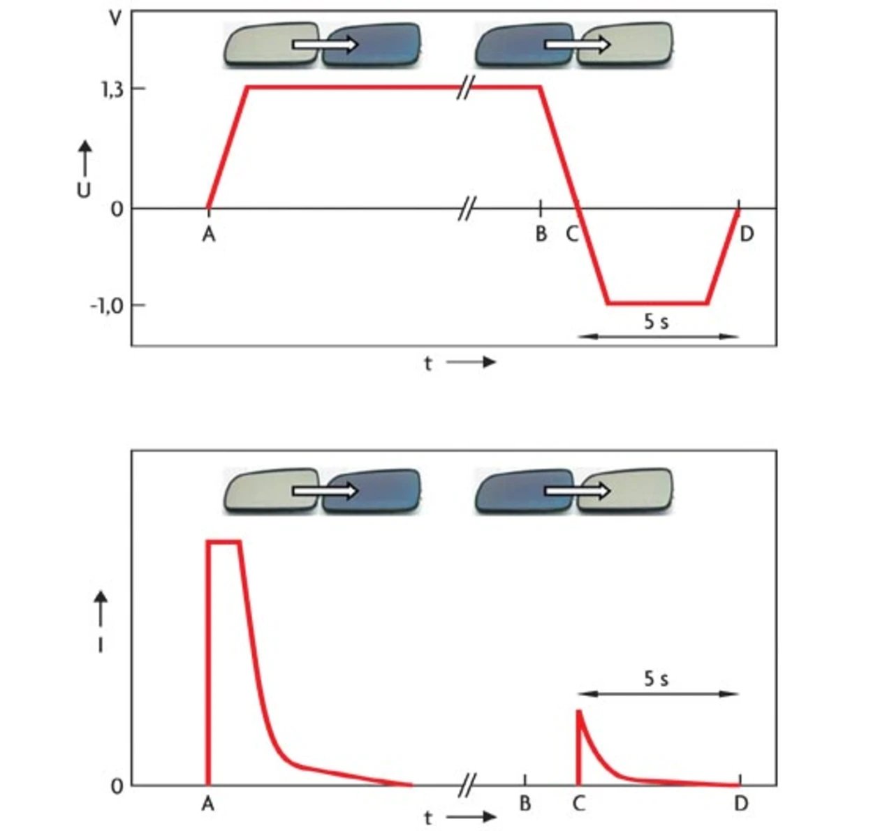 Im Folgenden wird ein kompletter Schaltzyklus (Einfärben und Aufhellen des EC-Spiegels) beschrieben. Bild 4 zeigt die Spannungs- und Stromverläufe. Der L99MM70 stellt dabei alle benötigten Schaltspannungen und Schutzfunktionen zur Verfügung. Zum Zeitpunkt A ist der Spiegel aufgehellt, die EC-Schicht ist entladen. Auf Grund einer Blendsituation erhält die Elektronik über den LIN-Bus das Signal, den Spiegel abzudunkeln. Der L99MM70 stellt eine Spannungsrampe von 0,5 V/s zur Verfügung und begrenzt die maximale Spannung auf 1,3 V. Durch die Spannungsrampe ist sichergestellt, dass der Ladestrom unabhängig von der Spiegelgröße unterhalb des maximal zulässigen Stroms von etwa 2 mA/cm2 liegt. Würde man direkt den Strom begrenzen, wäre hingegen eine Anpassung an die jeweilige Spiegelfläche notwendig. Die Grafik für den Strom zeigt, dass der Strom zunächst begrenzt ist und dann auf Null zurückgeht, es wird also keine Leistung mehr benötigt, nachdem der Spiegel die gewünschte Reflexion erreicht hat. Sobald keine Blendung mehr vorliegt, kann der Spiegel wieder aufhellen. Der L99MM70 stellt hierzu intermittierend eine Verbindung des Ausgangs mit Masse her, um die Ladung abzuführen. Wegen des Innenwiderstands des Spiegels und seiner hohen Kapazität ergibt sich eine Glättung der Spannung, so dass dieses Vorgehen einer Spannungsrampe von –0,5 V/s entspricht (Zeitraum B bis C). Im Stromdiagramm ist kein Strom dargestellt, weil dem Bordnetz keine Leistung entnommen wird. Abschließend wird für einen Zeitraum von 5 s (Zeit zwischen C und D) eine negative Spannung von 1,0 V angelegt, die sicherstellt, dass die gesamte Ladung aus der EC-Schicht entfernt und in die Ionen-Speicherschicht überführt wurde. Der L99MM70 erzeugt auch die negative Spannung mit einer Rampe, um den Strom zu begrenzen. Damit der EC-Spiegel im Falle eines Kabelbruchs, wie von den meisten OEMs vorgeschrieben, selbstständig auf eine Reflexion von mehr als 40 % aufhellt, befindet sich auf dem Spiegel ein Widerstand von 100 Ù, über den die Ladung abfließen kann. Dadurch fließt im völlig abgedunkelten Zustand ein Strom von 13 mA, der nicht in Bild 4 dargestellt ist, weil er gegenüber den 100 mA eines konventionellen Spiegels praktisch vernachlässigt werden kann