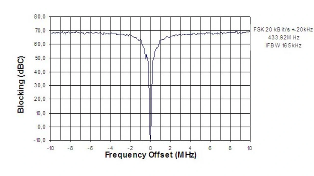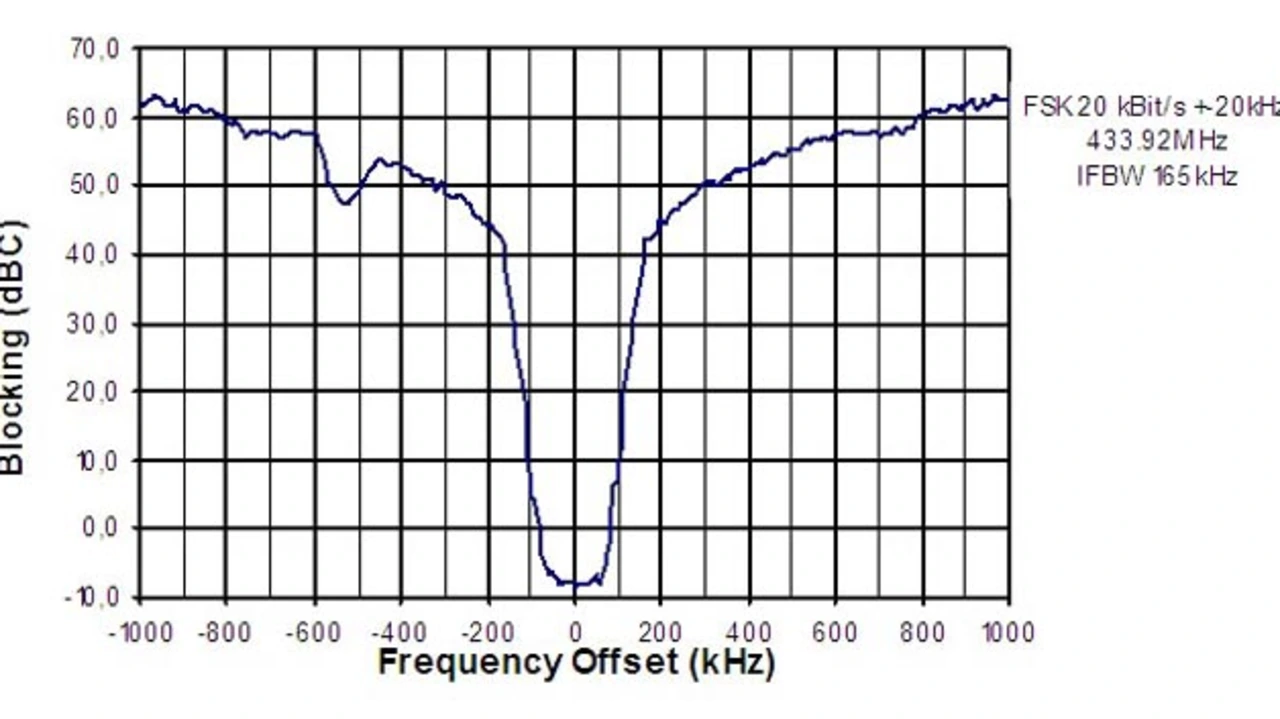 Bild 1 und Bild 2 zeigen die gemessenen Kennlinien des Sperrfilters eines Transceivers bei 1 MHz und bei 10 MHz Offset, f = 433,92 MHz, BW = 165 kHz, FSK, Datenrate = 20 kbit/s und einem Frequenzhub von ±20 kHz, der für Kfz-Schlüsselanwendungen entwickelt wurde.