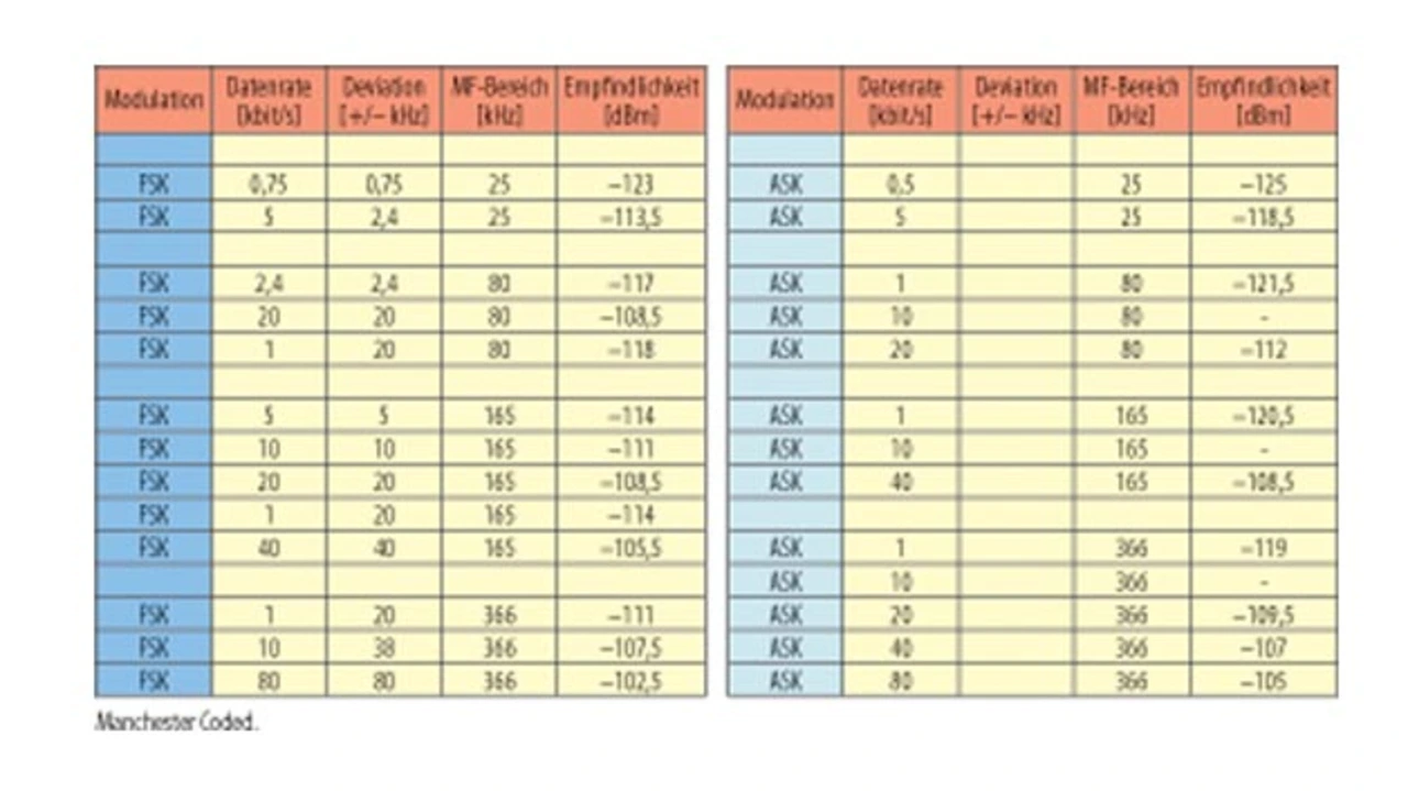 Ein solcher Empfänger ist in der Lage, FSK-modulierte Signale noch bis zu –123 dBm und ASK- modulierte Signale bis zu –119 dBm empfangen zu können. Tabelle 1 zeigt für einige Empfangskonfigurationen die erzielbaren Empfindlichkeiten.