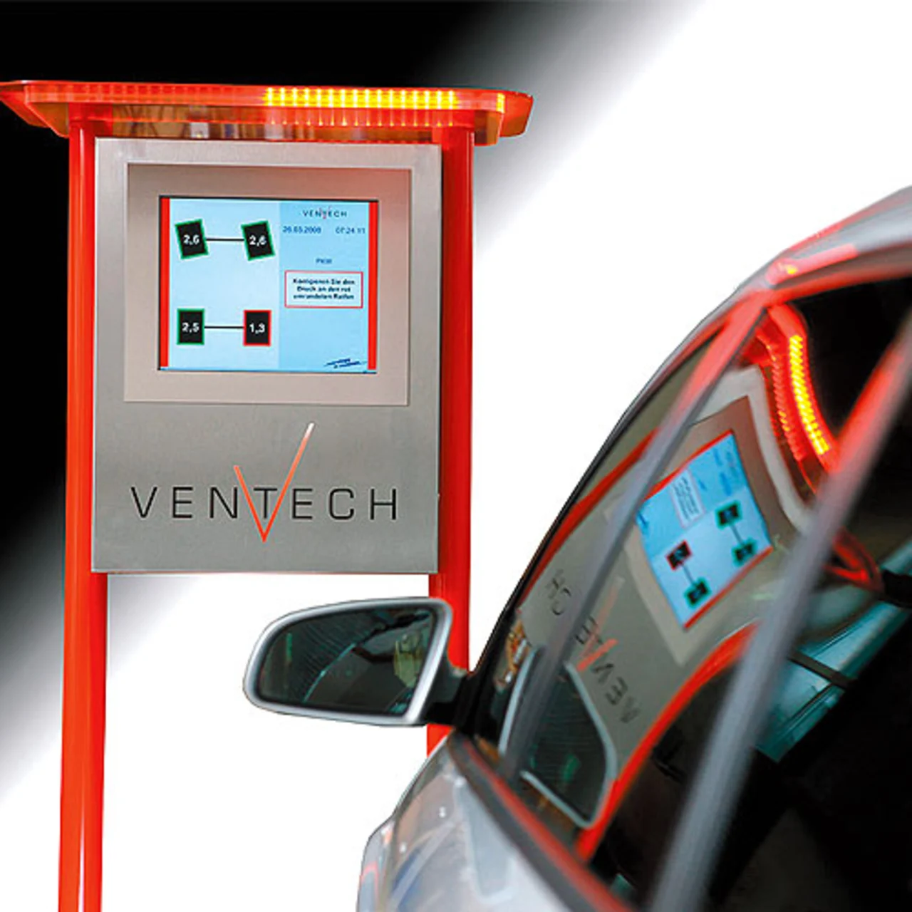 Zuverlässige Reifendruckkontrollen aller Reifen, etwa eines Sattelzuges mit 12 oder 18 Reifen, sind sehr zeitaufwendig und werden daher von Fahrern wie Fuhrparkbetreibern häufig vernachlässigt. Das neue Prüfsystem stellt Werte, die innerhalb einer vorgegebenen Toleranz liegen, grün umrandet dar, zu niedriger Luftdruck wird mit einem roten Rahmen markiert (Bild). Die Messwerte können, verknüpft mit der Fahrzeugidentität und dem Prüfdatum, zur internen Verwendung gespeichert und archiviert werden. Ein Vorteil gegenüber üblichen Reifendruckkontrollsystemen besteht darin, dass die Ventech-Systeme völlig ohne Einbauten im Fahrzeug oder Modifikationen am und im Reifen auskommen und von daher für jedes Bestandsfahrzeug sofort benutzbar sind. Als primäre Anwender spricht Ventech die Betreiber von Fuhrparks und Werkstätten mit dem System Pneuscan ATM Bus an. Bei diesem System kann der mit Spezialsensoren ausgestattete Messaufnehmer wahlweise in den Boden eingelassen oder als kleine befestigte Rampe ausgeführt werden. Der Messaufnehmer nimmt den Reifendruck während der langsamen Überfahrt mit hoher Genauigkeit von jedem einzelnen Reifen ab und gibt die Werte direkt an den Rechner des Messterminals weiter.
