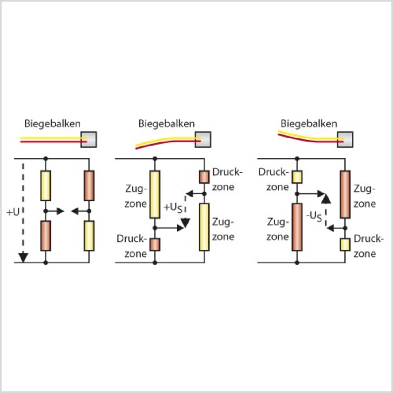 Dehnungsmessstreifen (DMS) werden normalerweise auf metallische Biegebalken geklebt und als Wheatstone-Brücke verschaltet. Sie liefern eine der Kraft proportionale Spannung, die in mV/V angegeben wird. Üblich sind hier Werte zwischen 1 mV/V und 4 mV/V. Das bedeutet: Um ein 100-Prozent-Signal zu erhalten, ist eine Verstärkung um den Faktor 250 bis 1000 erforderlich.