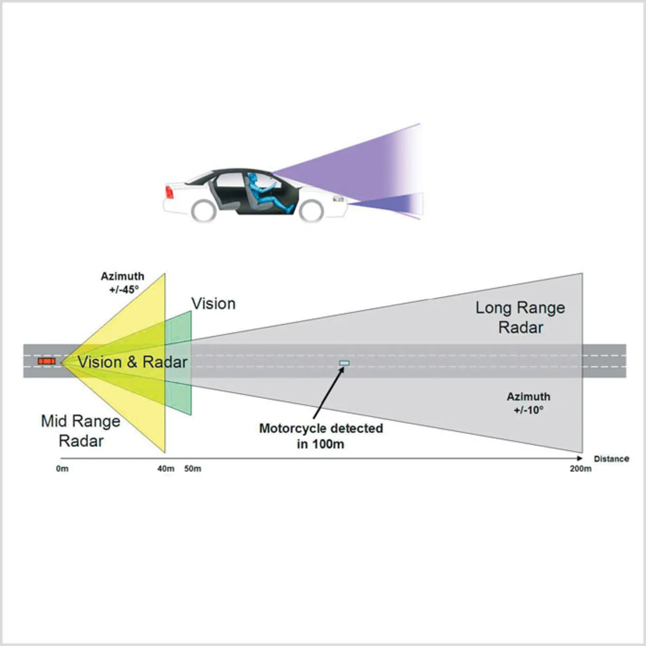 Im Radarbereich hat Delphi ein Mehrbereichssystem mit erweitertem Sichtfeld entwickelt (Bild). Es besteht aus einem Fernbereichsradar (200 m Erfassungsbereich) und einem Nahbereichs-Radarsensor (40 m Erfassungsbereich), die in einem Gehäuse verbaut sind. Diese Konfiguration erfasst mit hoher Zuverlässigkeit und einer Abtastrate von 40 ms bis zu 64 Objekte. Objekte im gemeinsamen Überwachungsbereich werden von beiden Sensoren unabhängig voneinander identifiziert und permanent abgeglichen.