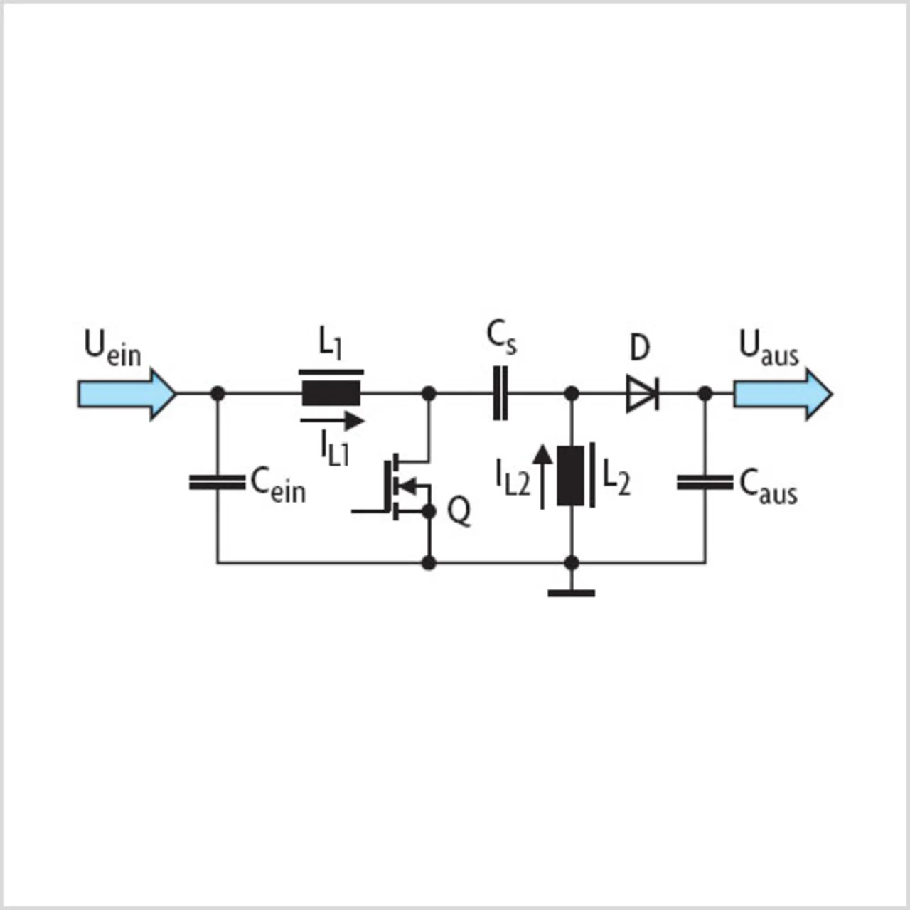 Die Anstiegssteilheit der Ströme IL1 und IL2 hängen von der Eingangsspannung und von den Induktivitätswerten der Spulen ab. Wenn der Schalter (Q) geschlossen wird, liegt an L1 die Eingangsspannung und an Cs eine Spannung, die genau so groß wie die Eingangsspannung ist. Der Strom steigt in den Spulen L1 und L2 an und Energie wird in den Spulen gespeichert. In dieser Zeit wird die Diode D in Sperrrichtung betrieben und der Ausgangskondensator muss den Strom für die angeschlossene Last liefern. Wenn der Schalter geöffnet wird, kehrt sich die Polarität der Spannung an den Spulen um. Die Diode leitet nun die gespeicherte Energie an den Ausgangskondensator und an die angeschlossene Last.