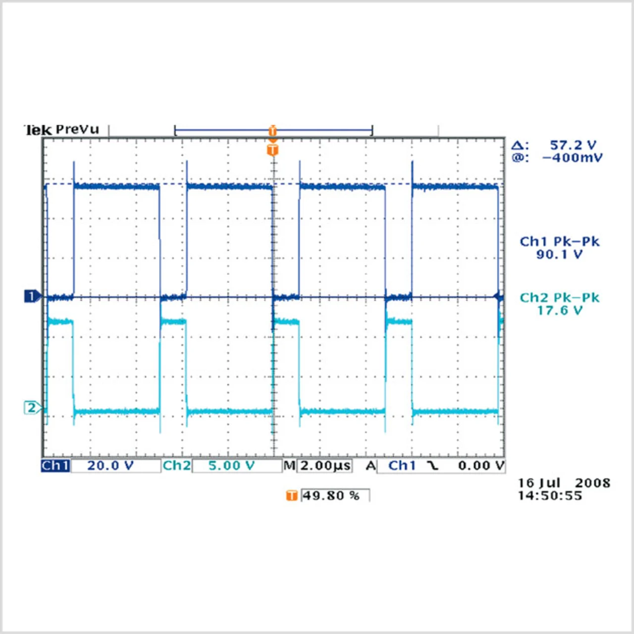 Die Kurven in Bild 5 zeigen die Drain- und die Gate-Spannung bei 40 V Eingangsspannung und 1 A Ausgangsstrom. Die Drain-Spannung ist die Summe von Eingangs- und Ausgangsspannung.