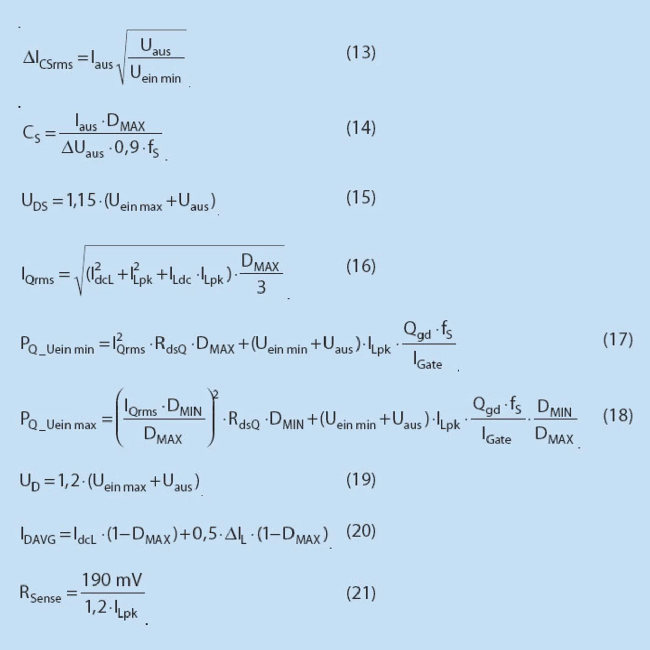 Da bei Anwesenheit von Spulen Schwingungen und Spikes auftreten, ist noch ausreichend Spannungsreserve zu berücksichtigen. Die Drain-Source-Spannung UDS des MOSFET sollte daher mindestens den in Formel 15 berechneten Wert haben. Der Effektivwert für den Schaltstrom errechnet sich nach Formel 16. Die Verlustleistungen bei minimaler und maximaler Eingangsspannung ergeben sich gemäß den Formeln 17 und 18. Dabei sind: RdsQ = Ein-Widerstand, Qgd = Gate-Drain-Ladung und IGate = Strom, den der MOSFET treiben oder aufnehmen kann.
