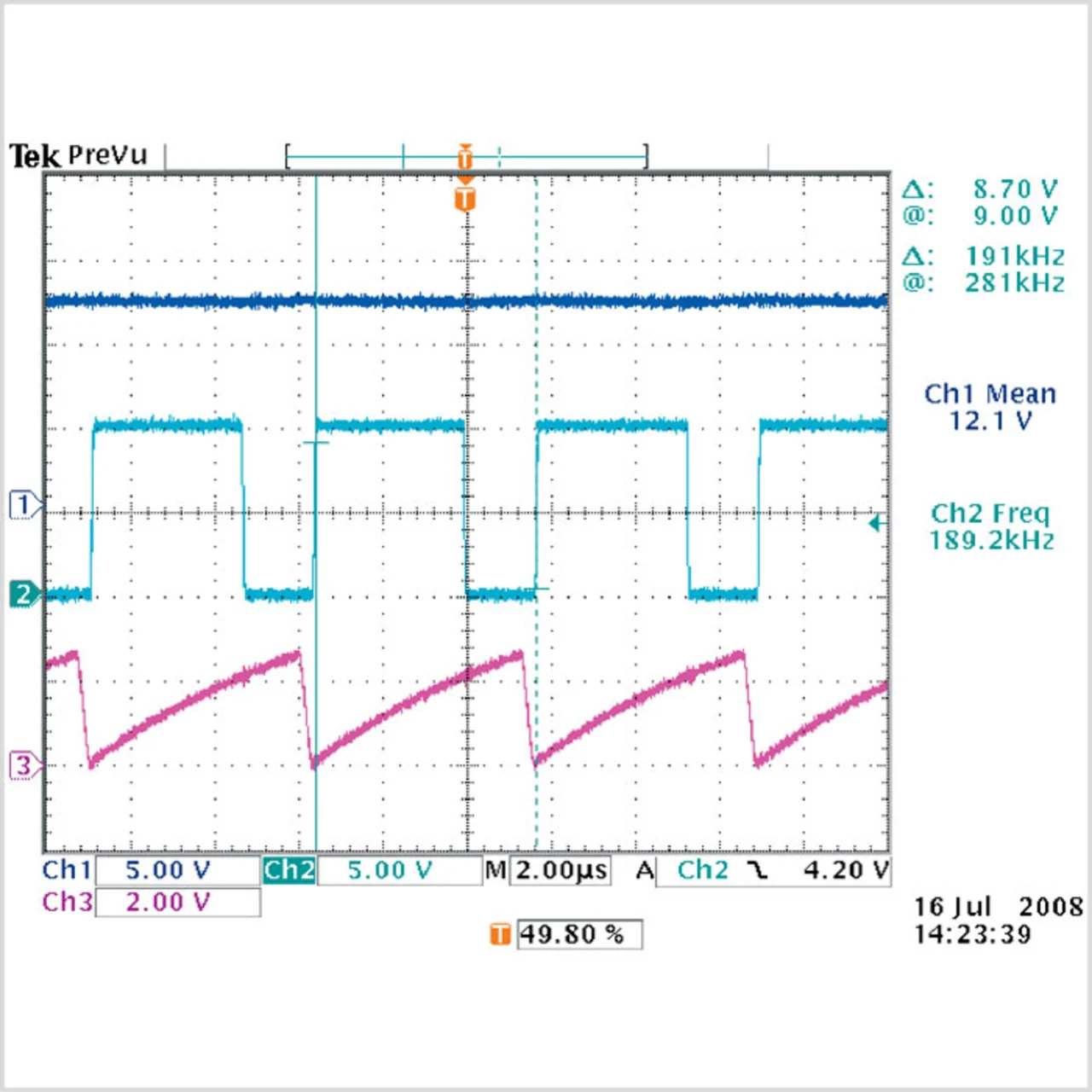 Das größte Tastverhältnis tritt bei Ueinmin auf; es beträgt 84,5 % bei einer minimalen Einschaltzeit von 1,08 μs. Beide Werte liegen innerhalb der Spezifikation. Bild 3 zeigt die Kurvenverläufe der 12-V-Ausgangsspannung, der Gate-Ansteuerung und des RC-Oszillators bei 6 V Eingangsspannung und 1 A Ausgangsstrom.