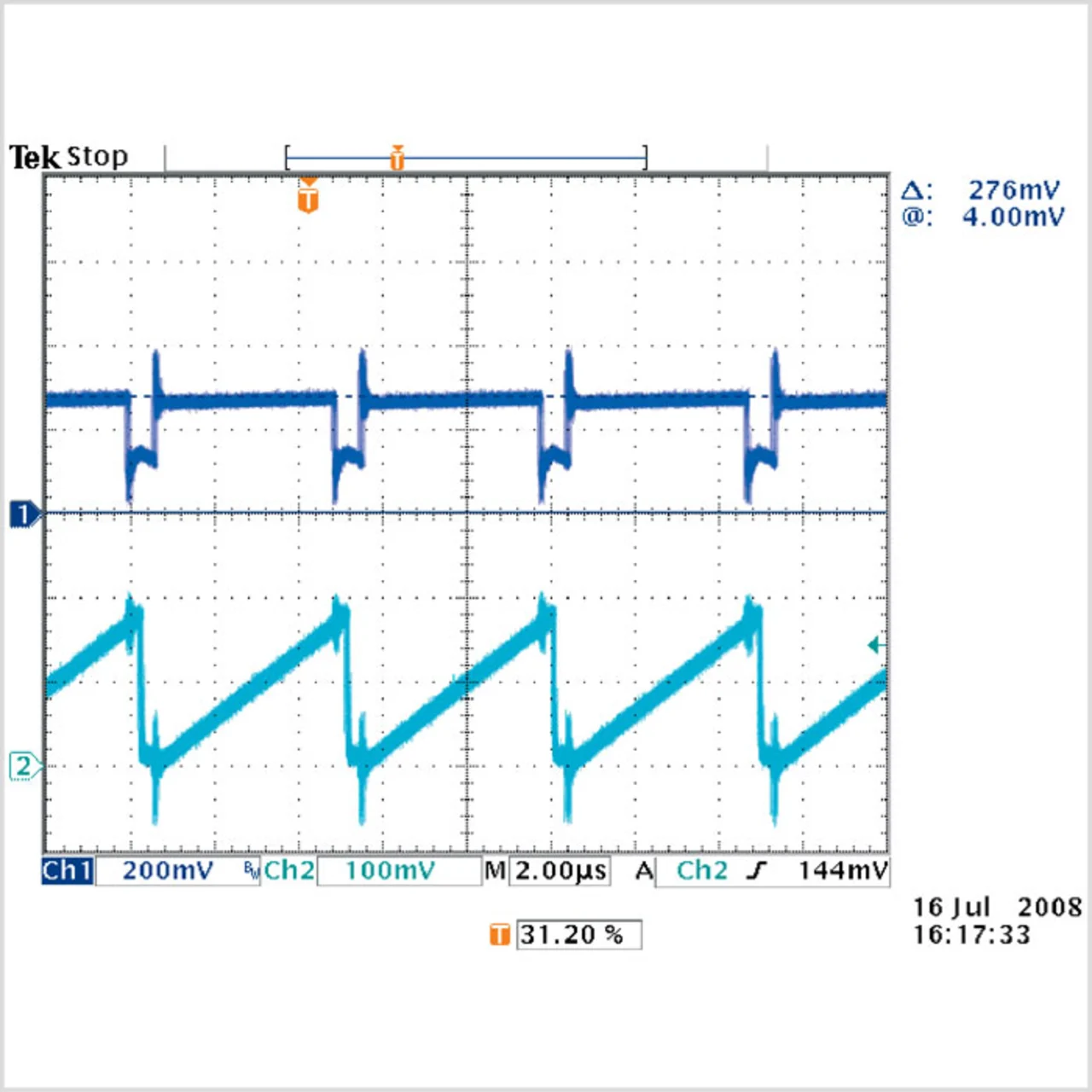 Für die Beispielschaltung ist ein 180-pF-Kondensator die richtige Wahl. Bild 6 zeigt die Spannung am Widerstand RSense und die Spannung der Anstiegs-Kompensation bei 2,5 V Eingangsspannung und 0,875 A Last.