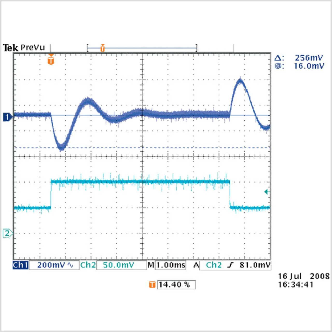 Die Kurven in Bild 7 und Bild 8 zeigen das dynamische Verhalten der Ausgangsspannung bei Lastwechsel und Sprüngen in der Versorgungsspannung. Der Ripple auf der Ausgangsspannung ist kleiner als 3 % bei 50 % Lastwechsel, Transienten auf der Eingangsspannung werden sauber ausgeregelt.