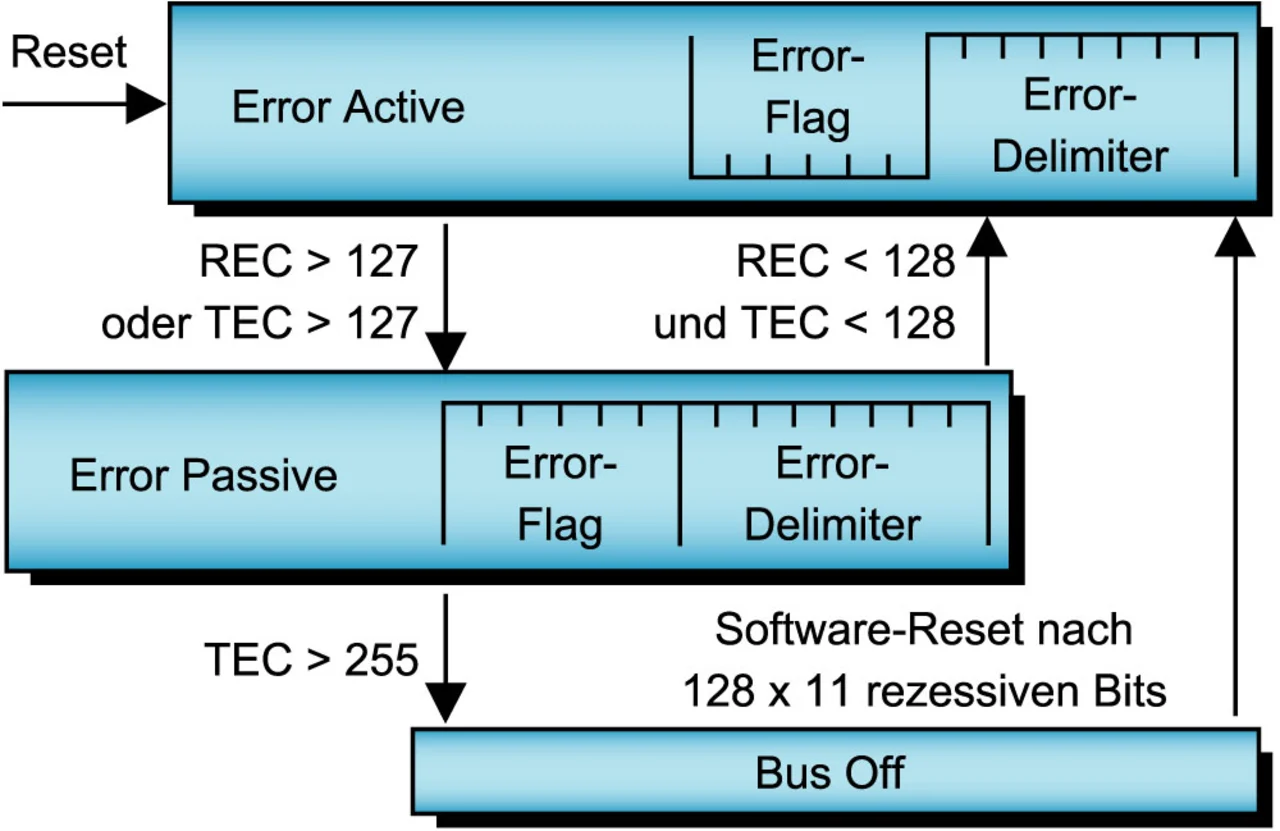 Die Fehlersignalisierung via Error-Flag versetzt jeden CAN-Knoten in die Lage, laufende Nachrichtenübertragungen abzubrechen. Da dies auch für defekte CAN-Knoten gilt, sind solche in der Lage, die gesamte CAN-Kommunikation zum Erliegen zu bringen. Um dies zu verhindern, verfügt jeder CAN-Knoten über eine Netzknotenüberwachung (Bild 5), die mittels Fehlerzähler und Regeln zur Steuerung der Fehlerzähler den defekten Knoten abschalten kann (Bus Off).