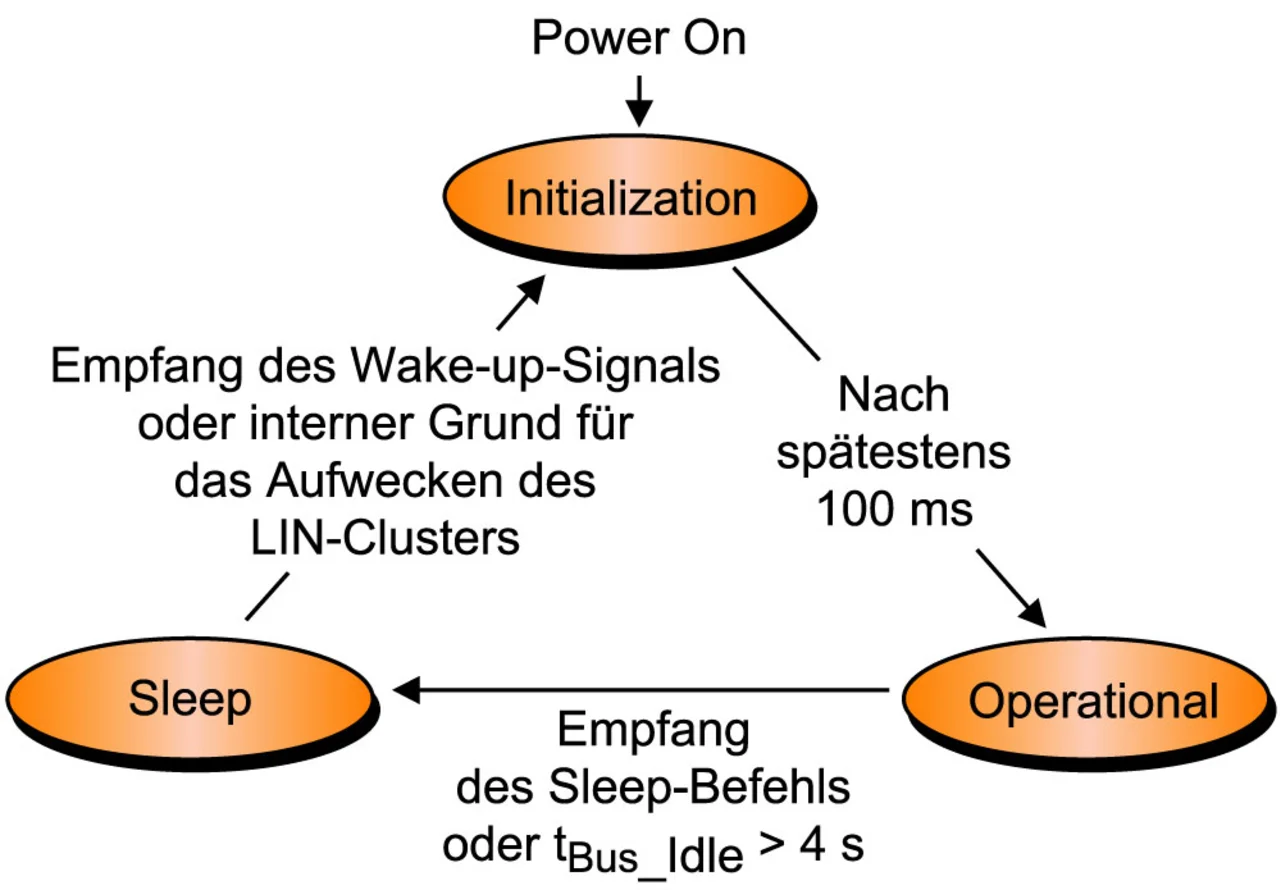 Umgekehrt wechselt ein LIN-Slave vom Sleep- über den Initialisierungs- in den Operational-Zustand, wenn er ein Wake-up-Signal, gefolgt von einem gültigen Header erkennt. Das Wake-up-Signal besteht aus einem dominanten Puls von mindestens 250 Mikrosekunden und höchstens 5 Millisekunden Dauer und kann von jedem LIN-Knoten gesendet werden. Die LIN-Spezifikation schreibt eine maximale Initialisierungsphase von 100 Millisekunden vor, das heißt, der LIN-Master muss spätestens nach dieser Zeitspanne mit der Abarbeitung der LIN-Schedule beginnen. Bleibt er passiv, sendet der entsprechende LIN-Slave ein weiteres Wake-up-Signal. Die Anzahl von und der zeitliche Abstand zwischen den Wiederholungen sowie Time Outs sind in der Spezifikation festgelegt.