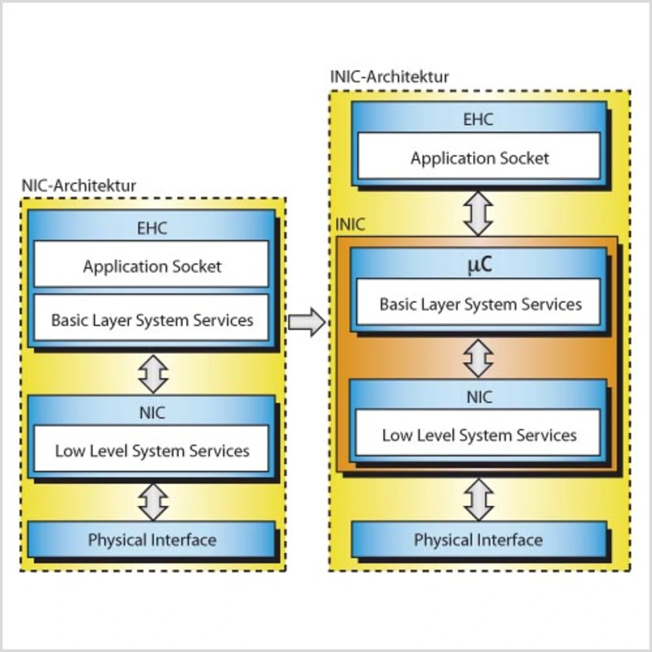 Das „MOST Network Interface“ (Bild 3) sorgt dafür, dass die auf unterschiedlichen MOST-Geräten untergebrachten Funktionsblöcke in der Lage sind, miteinander zu kommunizieren. Dabei erbringen die „MOST System Services“ („Low Level System“ und „MOST Network Services“) die Kommunikationsfunktionen, die für den Transport aller multimediarelevanten Daten (zeitkontinuierliche Bitströme, Paketdaten und Steuerdaten) notwendig sind. Die „Low Level System Services“ (Schicht-2-Dienste) sind in Hardware (Network Interface Controller; NIC) implementiert und setzen auf dem Physical Layer auf.