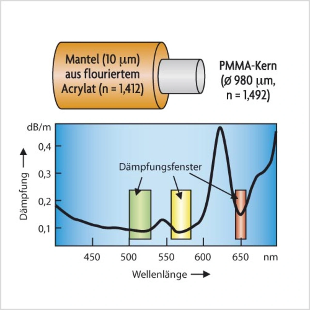 Aufgrund dieser Eigenschaft kann man Licht in einem optischen Leiter transportieren. Im MOST-System setzt man üblicherweise Polymerfasern zur optischen Signalübertragung ein, deren Kern aus PMMA (Polymethylmethacrylat) von einem dünnen Mantel aus fluoriertem Acrylat umgeben ist. PMMA hat eine größere Brechzahl als fluoriertes Polymer. Wenn der eingehende Lichtstrahl über dem Grenzwinkel liegt, wird aufgrund der Totalreflexion das Licht im Kern geführt. Die kleinsten Dämpfungen für das Übertragen von Licht in einer Step-Index-PMMA-Fasern erhält man bei 520 nm (grün), 560 nm (gelb) und 650 nm (rot). In erster Linie werden rote LEDs verwendet (Dämpfung: 0,14 dB/m), da sie sehr kostengünstig sind.