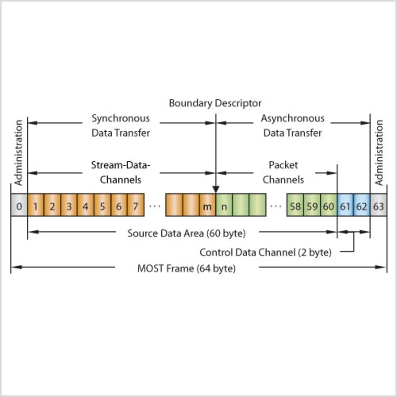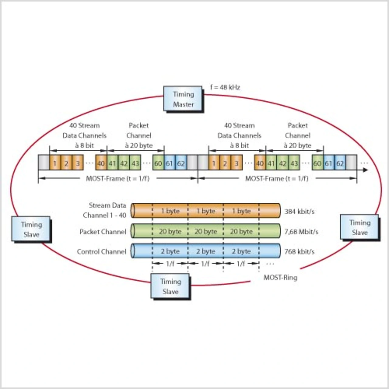 MOST ermöglicht die Übertragung von kontinuierlichen Bitströmen (Bitstreaming) ohne Pufferung und unnötigen Overhead. Dazu speist ein ausgewiesenes MOST-Gerät (Timing Master) den MOST-Frame (Bild 4) mit einer festen Frequenz (44,1 kHz oder 48 kHz) in das üblicherweise optische Übertragungsmedium ein.