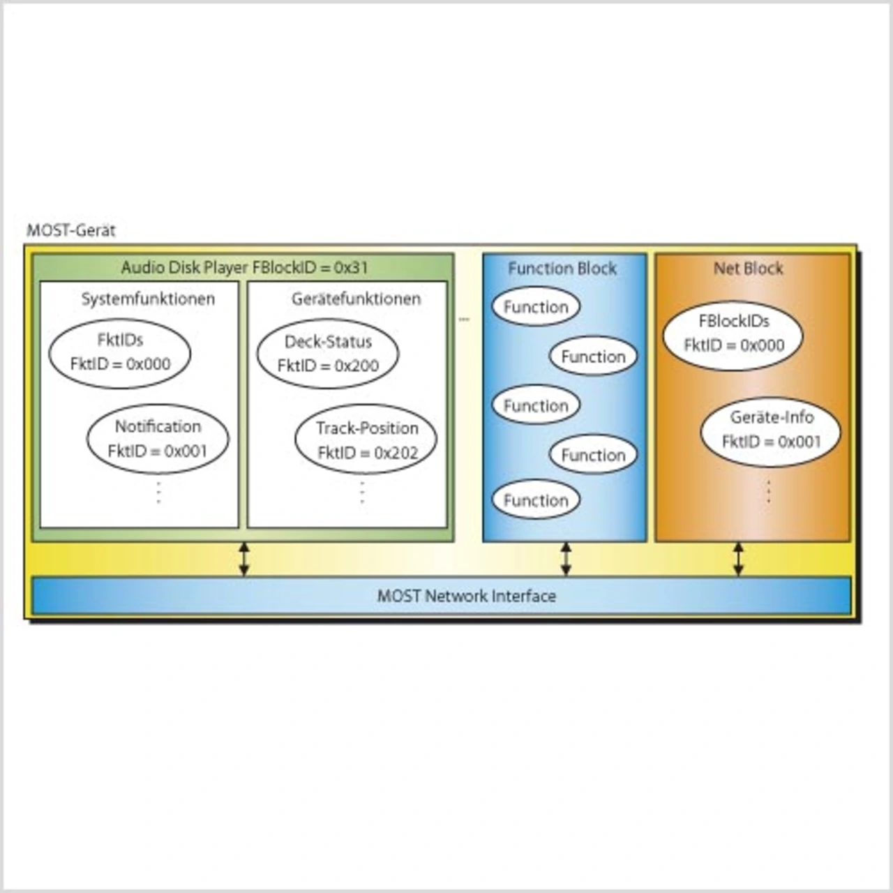 Ein MOST-Gerät gliedert sich in eine Funktions- und in eine Netzwerkebene (MOST Network Interface). Auf der Funktionsebene sind die Infotainment-Funktionen als Funktionsblöcke (Function Blocks) untergebracht. Jeder Funktionsblock wie etwa der „Audio Disk Player“ stellt dem MOST-Netzwerk einen dedizierten Satz von Funktionen (z.B. Track Position) zur Verfügung, auf die mittels Operation Types (z.B. Set zum Setzen eines Tracks, oder SetGet zum Setzen und Lesen eines Tracks) zugegriffen werden können (Bild 1).