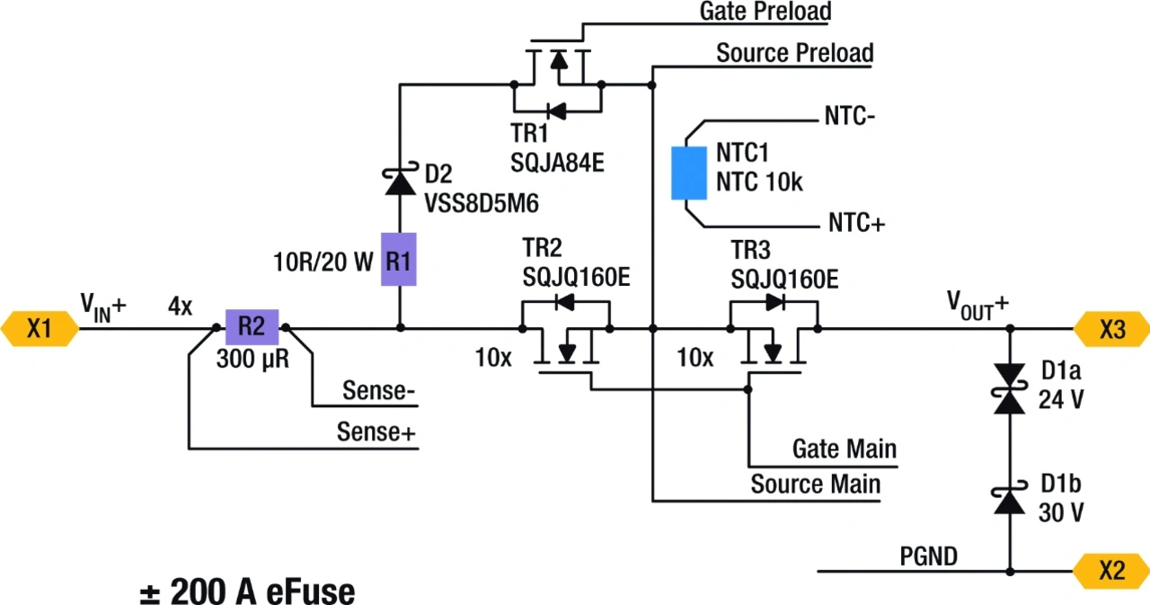 Vishay bietet ein Referenzdesign einer E-Fuse für den Einsatz im 48-V-Bordnetz. Damit lässt sich nicht nur die technische Machbarkeit einer solchen Anwendung zeigen, sondern auch die Leistungsfähigkeit der eigenen Leistungshalbleiter. So ermöglichen der Einsatz der neuesten Technologien und Entwicklungen die Realisierung einer 200-A-Sicherung im kompakten Design auf einer 125 × 60 mm2 großen FR4-Leiterplatte.
